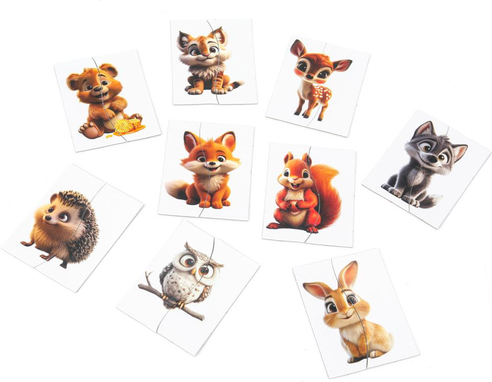 • взрослый собирает цельные картинки, выкладывает их в определённом порядке и рассказывает историю про животных, объясняет какие они и что любят. Затем карточки перемешиваются, задача ребёнка — подобрать правильные половинки, вспомнить, в каком порядке они лежали, и пересказать услышанную историю или сочинить собственную;