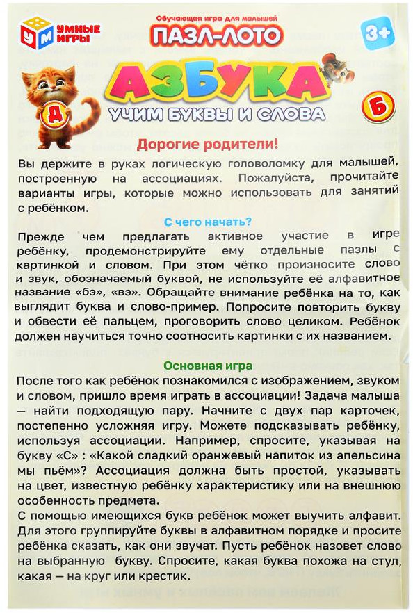 Развивающая игра-пазл «Азбука. Пазл-лото» ТМ «Умные игры» — увлекательный и полезный досуг для малышей. Набор состоит из 30 карточек-пазлов, на которых изображены красочная картинка с буквой алфавита и слово, которое можно составить из фишек-букв. Ребёнок изучит слова, звуки и буквы, сможет запомнить их названия и внешний вид. Игра пополнит словарный запас малыша и расширит его кругозор. |