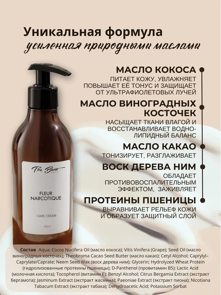 Крем для тела и рук: Aqua; Cocos Nucifera Oil (масло кокоса); Vitis Vinifera (Grape); Seed Оil (масло виноградных косточек); Theobroma Cacao Seed Butter (масло какао); Cetyl Alcohol; Caprylyl–Caprylate/Caprate; Neem Seed Wax (воск дерева ним); Glycerin; Hydrolyzed Wheat Protein (гидролизованные протеины пшеницы); D-Panthenol (провитамин В5); Lactic Acid (молочная кислота); Tocopherol (витамин Е); Benzyl Alcohol; Citrus Bergamia Extract (экстракт бергамота); Jasminum Extract (экстракт жасмина); Paeoniae Extract (экстракт пиона); Nicotiana Tabacum Extract (экстракт табака); Dehydroacetic Acid; Potassium Sorbat.