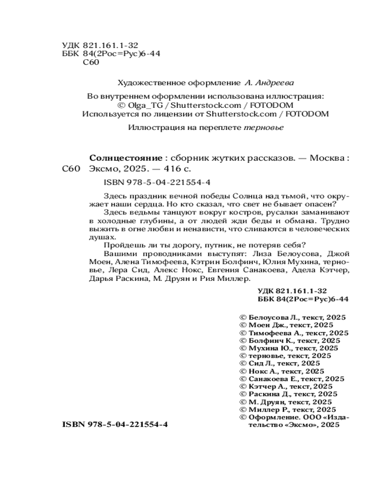 Серия: Young Adult. Гримуар Человеческая любовь быстротечна. Как и жизнь. Здесь праздник вечной победы Солнца над тьмой, что окружает наши сердца. Но кто сказал, что свет не бывает опасен? Здесь ведьмы танцуют вокруг костров, русалки заманивают в холодные глубины, а от людей жди беды и обмана. Трудно выжить в огне любви и ненависти, что сливаются в человеческих душах. Пройдешь ли ты дорогу, путник, не потеряв себя? Вашими проводниками выступят: Лиза Белоусова, Джой Моен, Алена Тимофеева, Кэтрин Болфинч, Юлия Мухина, терновье, Лера Сид, Алекс Нокс, Евгения Санакоева, Адела Кэтчер, Дарья Раскина, М. Друян и Рия Миллер. |