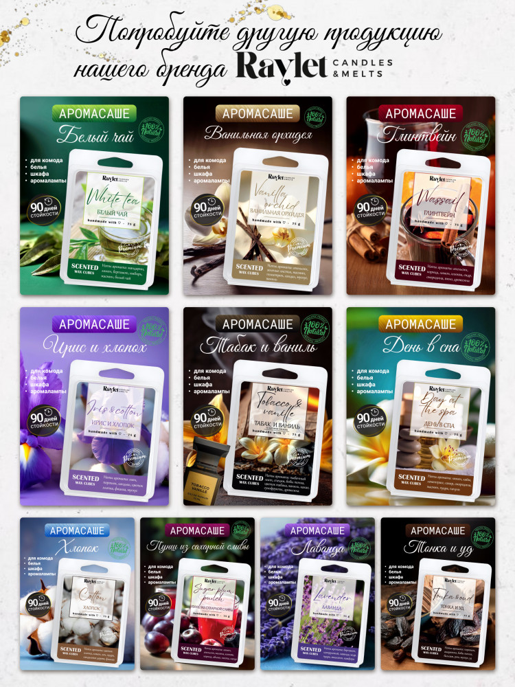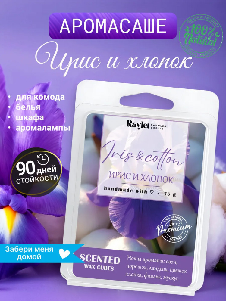 Ирис и хлопок-это лёгкий и чистый аромат, сочетающий свежесть хлопка с утонченными цветочными нотками ириса. Его воздушный и нежный запах создаёт атмосферу легкости и комфорта в вашем доме. Аромасаше восковое от Raylet-лучшее решение для любителей чистоты и свежих ароматов. Создайте в доме атмосферу уюта, комфорта и чистоты с помощью премиального воскового аромасаше ручной работы. Ручная работа, соевый воск, премиальные аромамасла и блёстки-идеальное сочетание для стильного интерьера и стойкого аромата. Используйте восковые арома кубики wax melts для белья в шкафу, комоде, рабочем столе, спальне, ванной или в аромалампе. Сохраняет насыщенность аромата до 90 дней. Один продукт — множество способов применения!