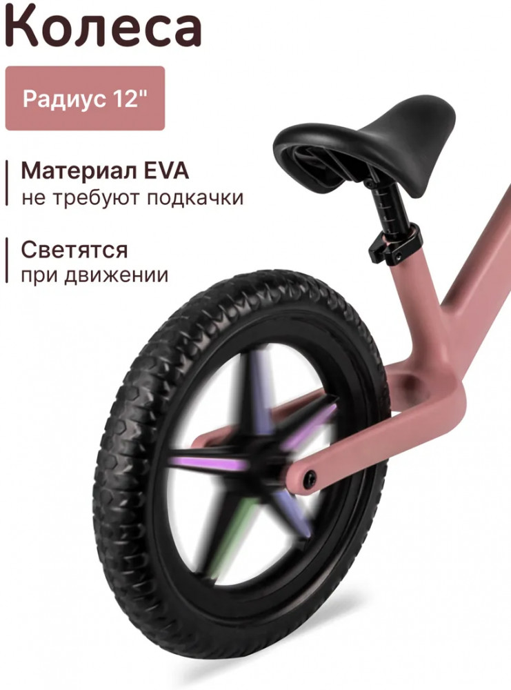 • безопасный — мягкие колеса из прочного материала EVA не требуют подкачки, а также защищают от тряски и ударных нагрузок во время катания; устойчивая конструкция оберегает юного райдера от падения; беговел изготовлен из качественных материалов, которые полностью безопасны для детей;