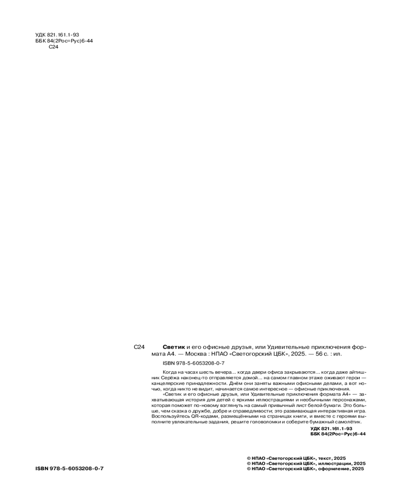 Серия: Книги для увлеченных детей Захватывающая детская история с яркими иллюстрациями и необычными героями: листочком Светиком, ластиком Стирашкой, планшетом Планшуриком и другими офисными обитателями. Днем они заняты важной работой, а ночью, когда никто не видит, начинают свои приключения... «Светик и его офисные друзья, или Удивительные приключения формата А4» — это не только сказка, но и развивающая интерактивная игра. На страницах книги размещены QR-коды, с помощью которых можно вместе с героями выполнить увлекательные задания, решить головоломки и даже собрать самый надежный бумажный самолетик. |