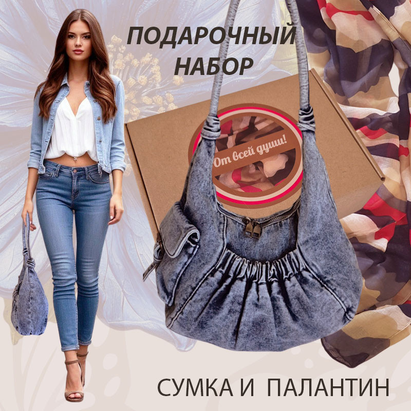 Представляемый подарочный набор состоит из комплекта: это сумка из вареной джинсовой ткани и палантин, которые безупречно дополняют друг друга. Палантин соткан из смеси натуральных волокон хлопка и вискозы — он удивительно нежный, легкий и приятный на ощупь. Рисунок палантина имеет графический яркий принт, что позволяет ему подойти не только к сумке из данного набора, но и ко многим вещам гардероба.