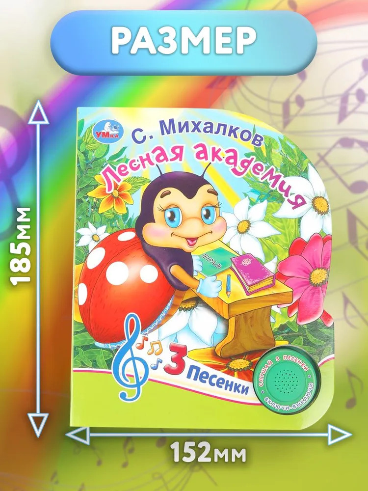 Серия: 1 кнопка 3 песни Музыкальная книга «С. Михалков. Лесная академия» ТМ «УМка» станет прекрасным подарком для малыша. Ребёнок с удовольствием будет листать плотные страницы, рассматривать красочные картинки, вместе с родителями читать написанный по мотивам старинной песенки стих про животных и азбуку, а также слушать мелодичные песни. Малыш легко освоит включение звука: по нажатию на кнопку песенка включится, при втором нажатии выключится, при третьем — заиграет следующая композиция и т.д. Благодаря компактному размеру книгу удобно взять с собой в дорогу. Рекомендовано детям младшего дошкольного возраста. |