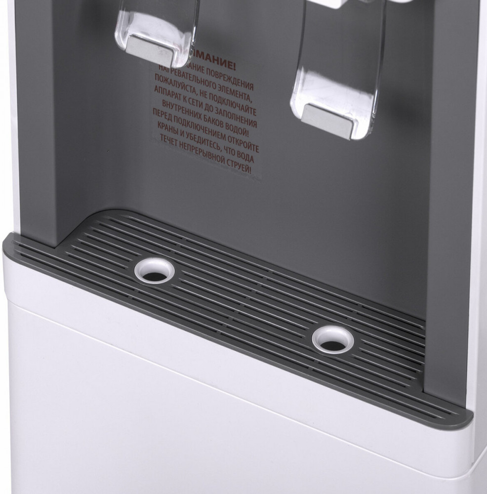 Вода нагревается с помощью ТЭНа мощностью 420 Вт, что позволяет достичь температуры 95 °С за считаные минуты. Компрессорное охлаждение мощностью 85 Вт обеспечивает поддержание температуры холодной воды на уровне 10 °С. Кулер предназначен для напольного размещения и имеет 2 крана типа «нажим кружкой» для подачи горячей и холодной воды.