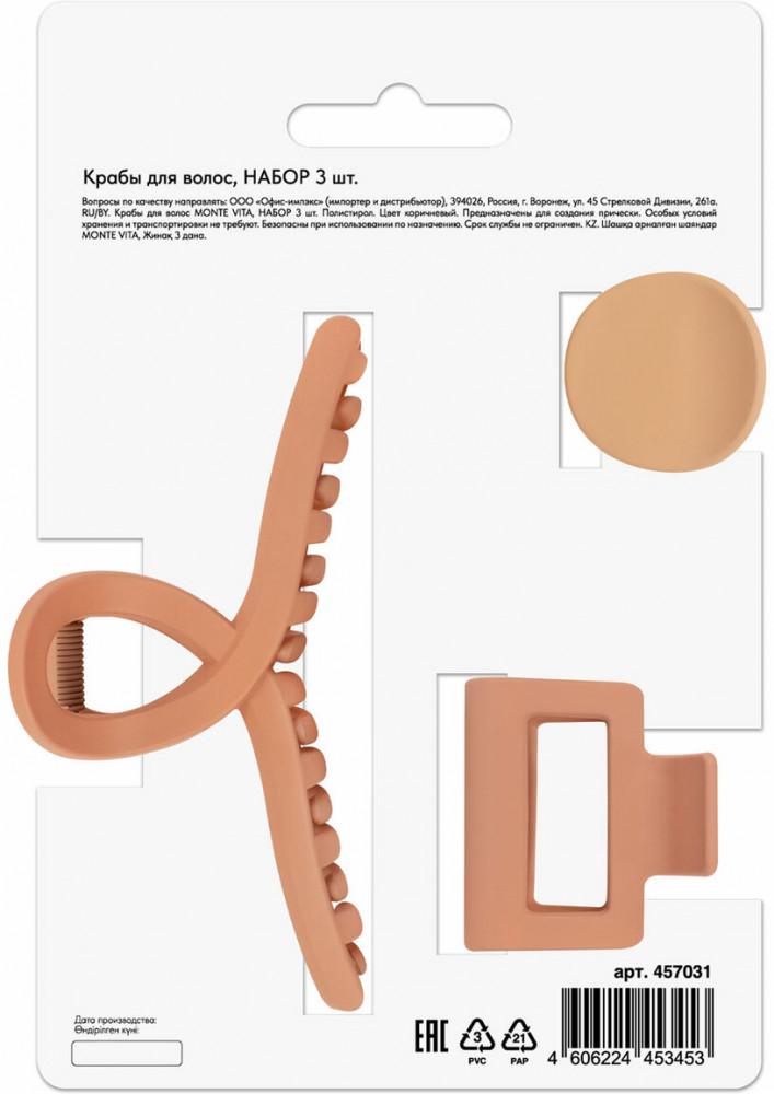 Крабы для волос Monte Vita — незаменимые аксессуары для создания прически: от романтичной до строгой и деловой. Они являются неотъемлемой частью стильного образа современной девушки. Удобны и просты в использовании. Набор из трех крабов в натуральных коричневых оттенках для создания многоуровневых укладок. Размеры аксессуаров (4 см, 5 см, 11 см) позволяют комбинировать их: мелкие крабы подойдут для фиксации челки, а крупный — для создания объемного пучка. |