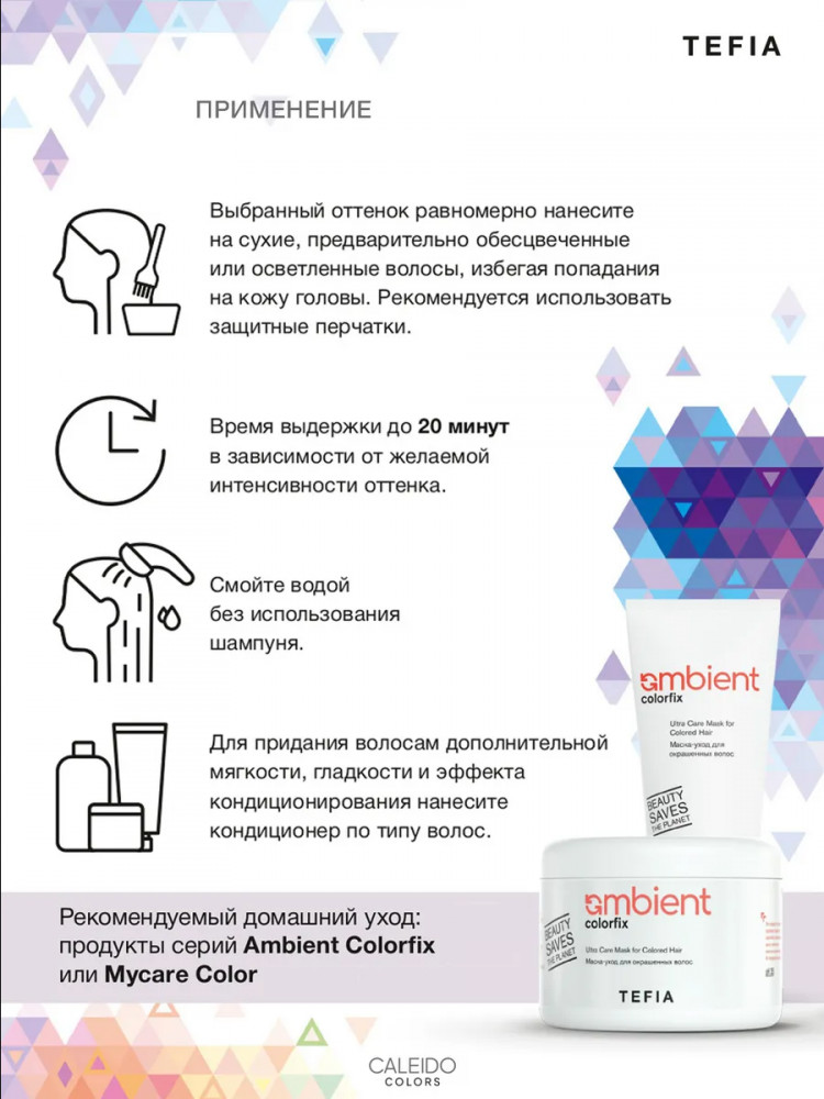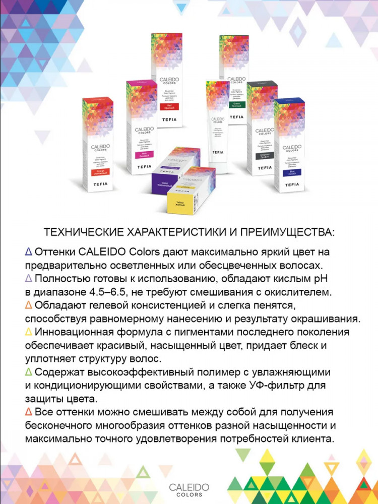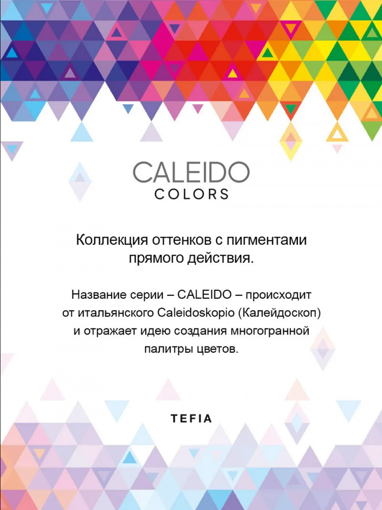 Caleido Colors — инновационная коллекция оттенков для волос с пигментами прямого действия. Название серии, Caleido, вдохновлено итальянским словом «Caleidoskopio» (Калейдоскоп), символизируя многогранность и разнообразие цветовых решений. Эта коллекция разработана для создания ярких и насыщенных оттенков на предварительно осветленных или обесцвеченных волосах.
