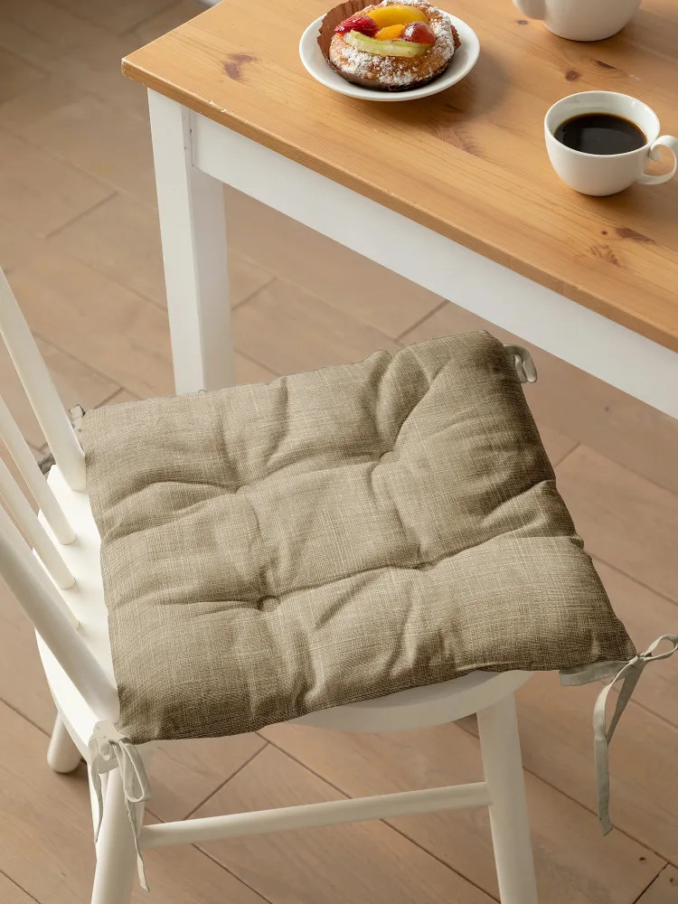 Квадратная подушка на стул (40×40×8 см) идеально дополнит интерьер кухни или гостиной. Завязки по углам будут прочно фиксировать подушку на стульях, обеспечивая вам максимальный комфорт при посадке. Чехол из рогожки (100% хлопок) имитирует лен и отличается стойкостью к износу, а мягкий наполнитель подушечки хорошо сохраняет форму. Эта упругая подушка плотностью 165 г/м2 — настоящая находка для обладателей стульев с твердым сидением. Они позволят сделать ваш отдых гораздо комфортнее.