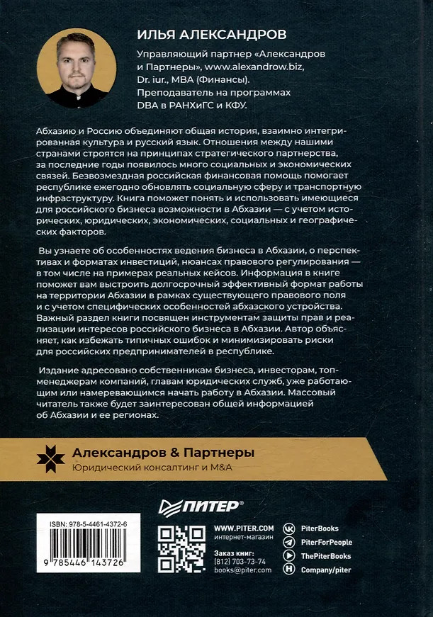 Серия: Бизнес-психология (твёрдый переплет) Абхазию и Россию объединяют общая история, взаимно интегрированная культура и русский язык. Отношения между нашими странами строятся на принципах стратегического партнерства, за последние годы появилось много социальных и экономических связей. Безвозмездная российская финансовая помощь помогает республике ежегодно обновлять социальную сферу и транспортную инфраструктуру. Книга поможет понять и использовать имеющиеся для российского бизнеса возможности в Абхазии — с учетом исторических, юридических, экономических, социальных и географических факторов. |
