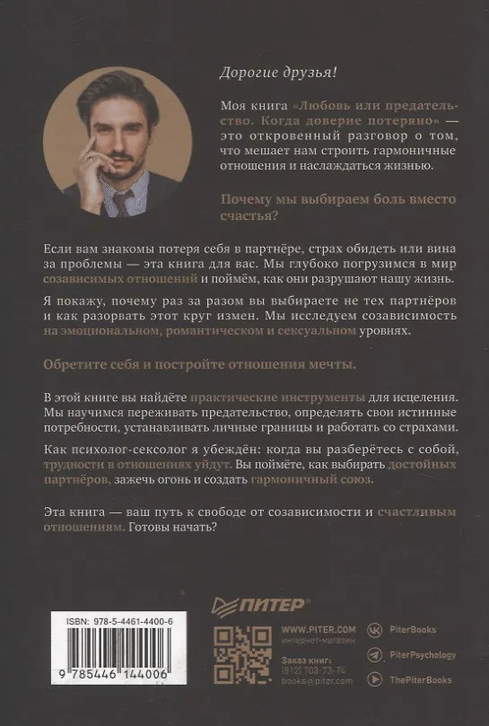 Серия: Сам себе психолог (твёрдый переплет) Эта книга — не просто теоретическое руководство, а живой рассказ о людях, стремящихся к любви и пониманию. Это приглашение к глубокому самоанализу и шагам к здоровым отношениям, где каждый найдет поддержку и вдохновение на своем пути к свободе от созависимости. В этой книге вы найдете глубокое понимание созависимых отношений и их разрушительного воздействия на вашу жизнь. Если вам знакомы такие чувства, как потеря себя в партнере, страх обидеть или расстроить его, а также постоянное ощущение вины за проблемы в отношениях, то эта книга создана для вас. Автор подробно рассматривает причины и последствия созависимости на различных уровнях: сексуальном, романтическом и эмоциональном. Вы узнаете, почему выбор токсичных партнеров становится привычным, и как избежать измен, которые часто происходят из-за недостатка доверия и взаимопонимания. Книга предлагает практические советы о том, как пережить измену и восстановить себя после предательства. |