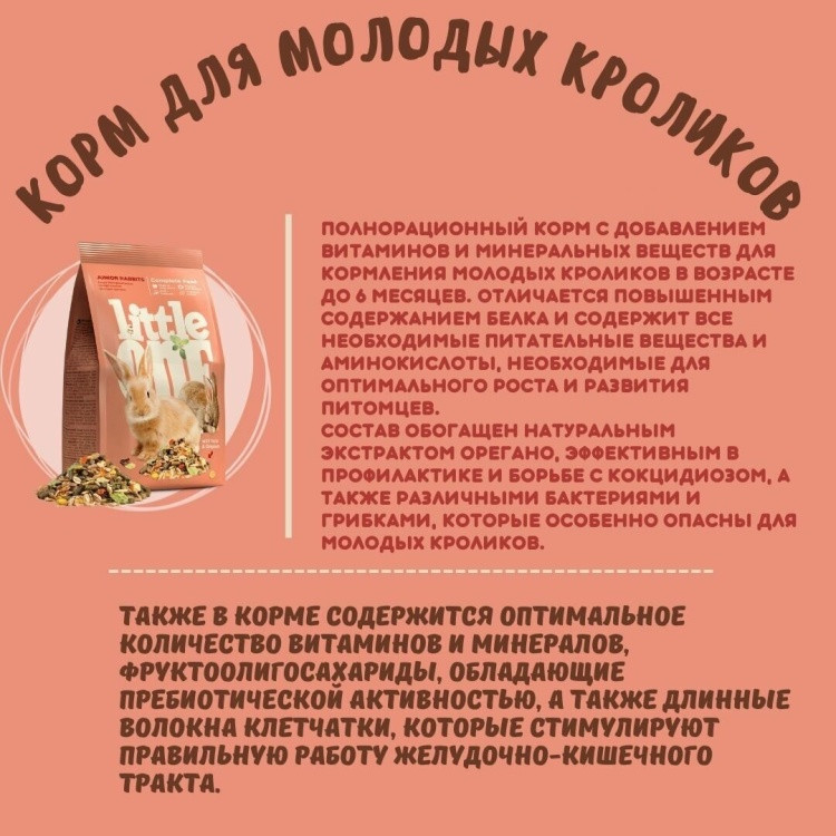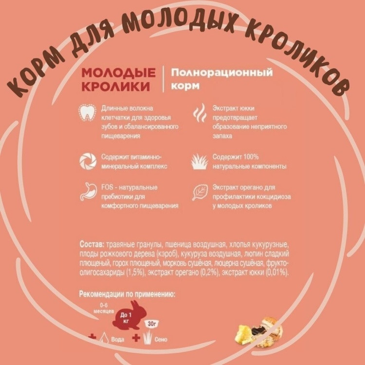 Полноценный корм с добавлением витаминов и минеральных веществ сбалансированный в соответствии с пищевыми потребностями кроликов. Рацион отличается высоким содержанием клетчатки необходимой для правильного пищеварения кроликов. Состоит из травяных гранул плющеных зерен сушеных овощей сушеной люцерны сушеного яблока. Суточная доза корма для молодого кролика составляет 30 грамм в расчете на килограмм веса зверька кормите кролика 2-3 раза в день в одно и то же время следите чтобы у кролика всегда была свежая вода помните что любые зерновые корма следует сочетать со свежими продуктами кроликам необходима свежая зелень и овощи важно включать в рацион траву листья и ветки лиственных пород деревьев помните что у кроликов всегда должно быть сено. сено для кроликов должно быть мелким хорошо облиственным и разнообразным по ботаническому составу. Состав: пшеница воздушная, хлопья кукурузные, плоды рожкового дерева (кэроб), кукуруза воздушная, люпин сладкий плющеный, горох плющеный, морковь сушеная, люцерна сушеная, фруктоолигосахариды (1.5%), экстракт орегано (0.2%), экстракт юкки (0.01%).