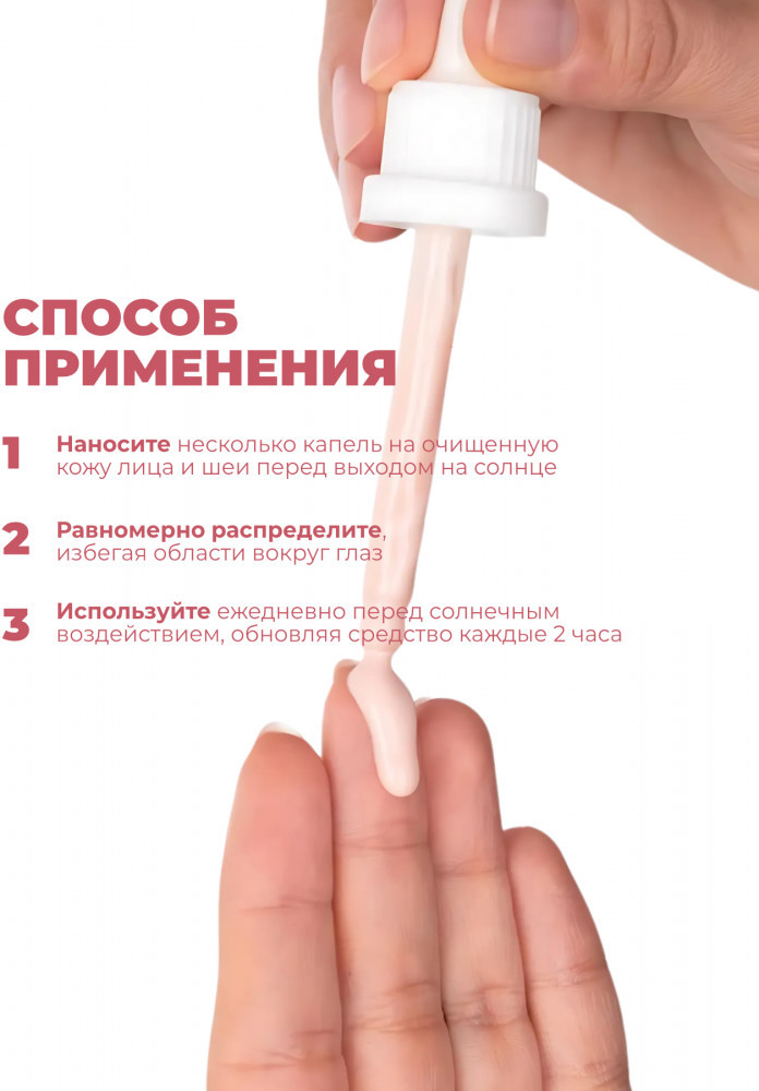Способ применения: нанесите достаточное количество сыворотки на кожу за 15 минут до выхода на солнце. Для обеспечения длительной защиты от солнца наносите средство повторно после того, как вспотеете или вытретесь полотенцем. При длительном пребывании на солнце обновляйте средство каждые два часа.