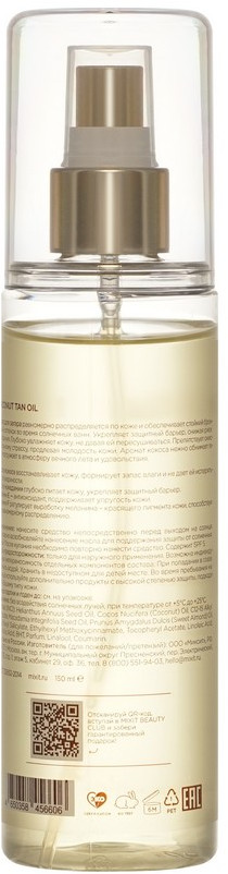 Масло равномерно распределяется по коже и обеспечивает стойкий бронзовый оттенок во время солнечных ванн. Укрепляет защитный барьер, снижая риск обгорания. Глубоко увлажняет кожу, не давая ей пересушиваться. Препятствует окислительному стрессу, продлевая молодость кожи. Аромат кокоса нежно обнимает тело и погружает в атмосферу вечного лета и удовольствия.