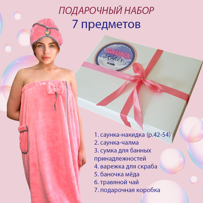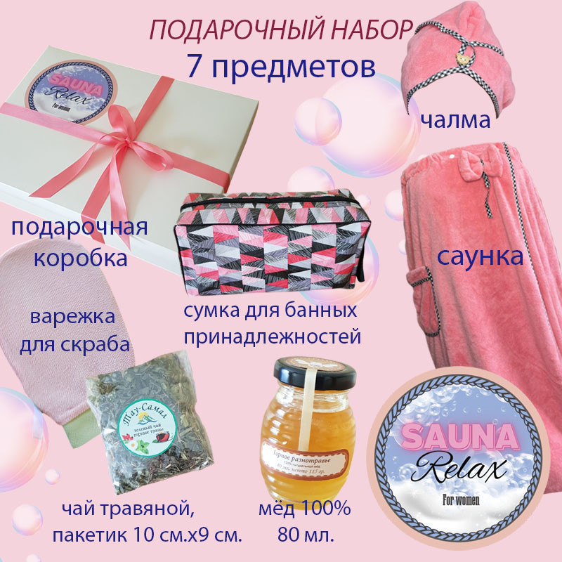 Подарочный набор для милых дам предназначен не только для приятного времяпровождения в сауне или бане, но и всегда пригодится для повседневного домашнего использования. Ведь так удобно обернуться в мягкую саунку из микрофибры даже после душа. Саунка имеет регулируемый размер, благодаря растягивающейся резинке. В комплекте с саункой идёт чалма, которая не только впитает лишнюю влагу с волос, но и сделает эффектным женский образ даже после водных процедур. Будьте уверены, что такой комплект в своем арсенале захочет иметь любая женщина! В дополнение к саунке также прилагается удобная сумка для банных принадлежностей и варежка для скрабинга. А 100% натуральный мед и ароматный травяной чай, который представляет смесь зеленого чая и горного разнотравья, позволит погрузится в атмосферу релакса после банных процедур. Набор красиво упакован в подарочную коробку, что придаст особенное настроение праздничному случаю. Приобретая такой комплект в подарок, Вы безусловно обрадуете и удивите получателя, и, мы уверены, захотите подарить такой же набор себе. Если Вы мужчина, который приобретает подарок даме, не стоит сомневаться — Ваш выбор оценят очень высоко, вы на верном пути! |