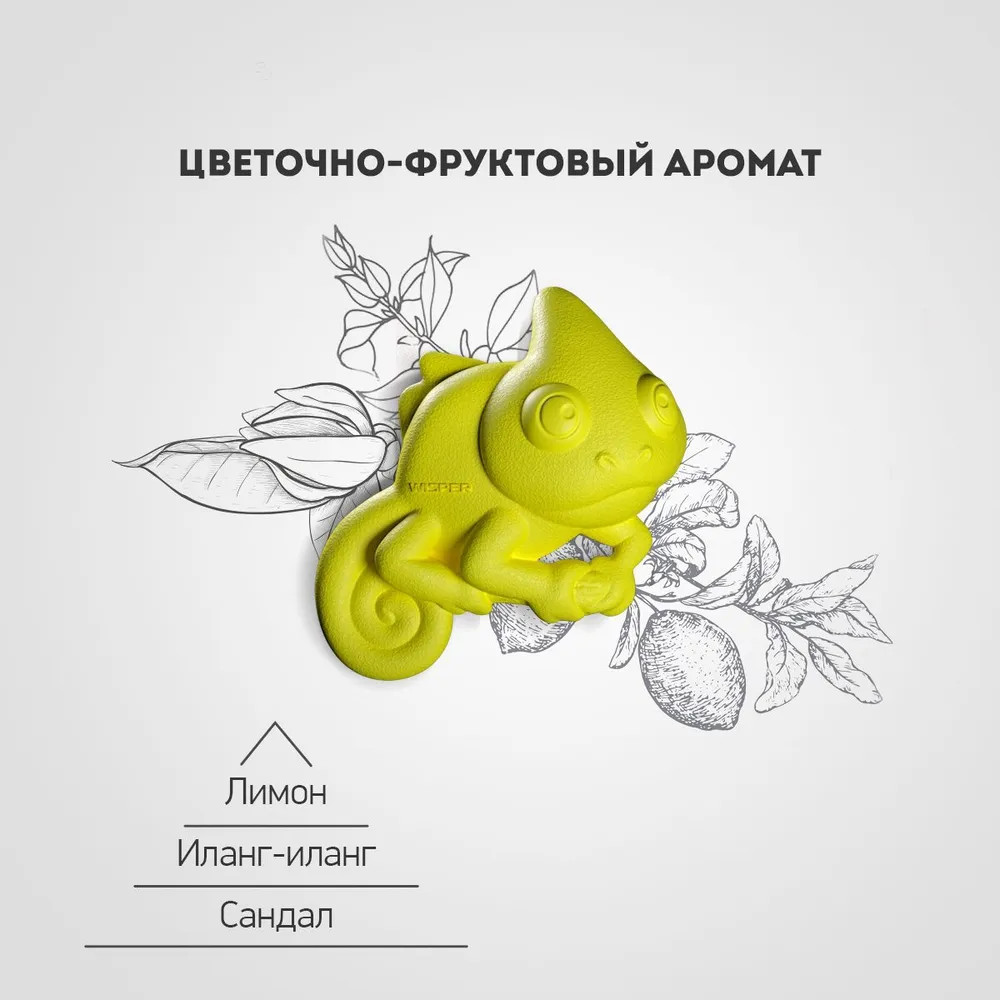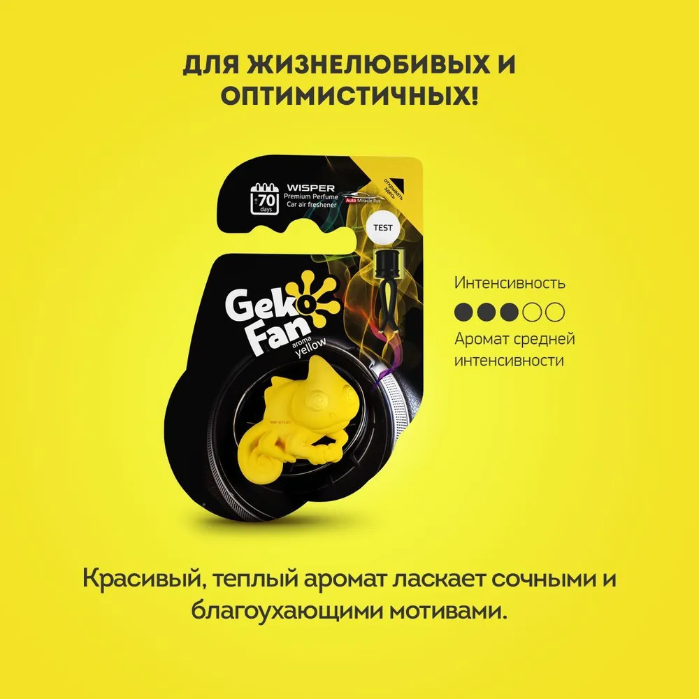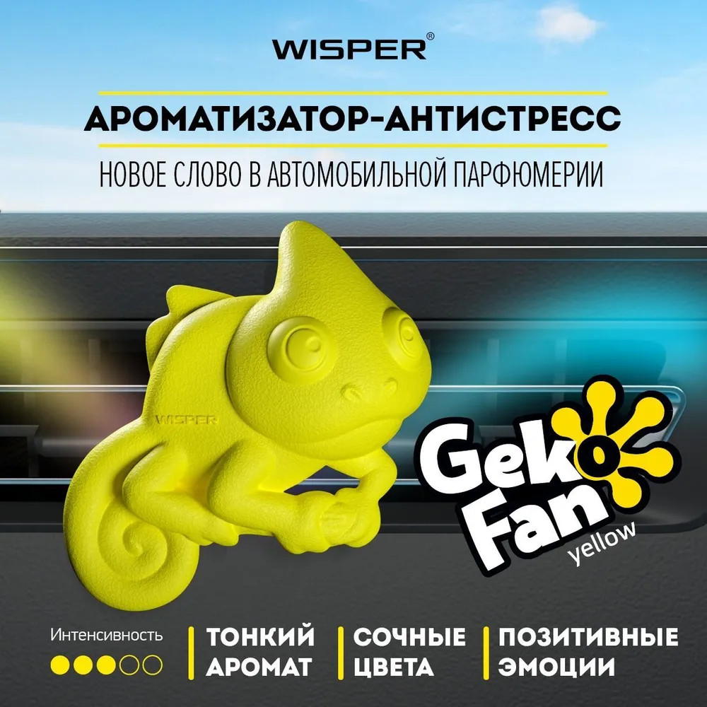 Wisper GekoFan — новое слово в автомобильной парфюмерии. Это ароматизатор-антистресс, который позволит вам не только наслаждаться приятными ароматами в дороге, но и все время быть в тонусе, избегая утомления и неприятных мыслей. Wipser Gekofan Yellow: великолепный ярко-желтый Гекон для поднятия настроения как универсальное лекарство от депрессии. Красивый, теплый аромат ласкает сочными и благоухающими мотивами.