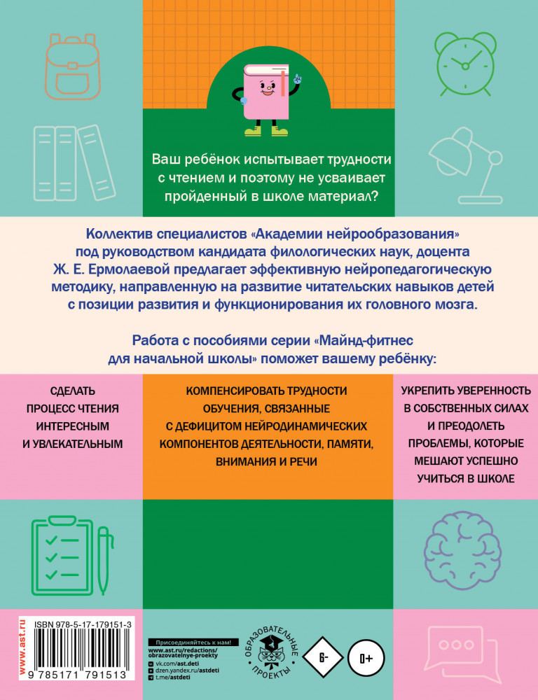Серия: Майнд-фитнес для начальной школы Пособие серии «Майнд-фитнес для начальной школы» содержит материалы для обучающихся 4 класса, основанные на авторской нейропедагогической методике развития навыков чтения. Работа с тетрадью поможет им компенсировать трудности обучения, связанные с дефицитом нейродинамических компонентов деятельности, памяти, внимания и речи. Соответствует ФГОС, ФОП, ФРП НОО. |