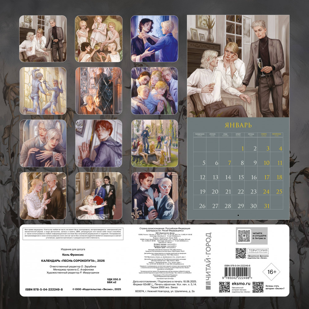 Календарь настенный на 2026 год «Песнь Сорокопута»В данный момент этот товар отсутствует в продаже. Возможно, у нас найдется аналогичный или похожий товар здесь. Серия: Черным-бело. Мерч Календарь на 2026 год с сюжетными иллюстрациями из подарочного издания цикла «Песнь Сорокопута». Героев любимой истории изобразила Кристина Демина. Настенный календарь с иллюстрациями к подарочному изданию цикла Фрэнсис Кель «Песнь Сорокопута». Проблемы отцов и детей, классовое неравенство, дружба и семья, рассуждения о Сергее Дягилеве и Александре Македонском, поиск себя и истины, императорские интриги и дух революции — это «Песнь Сорокопута». В календаре отмечен день рождения фандома. |