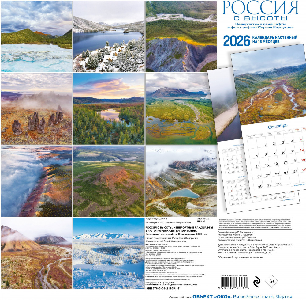 Серия: Календари настенные 2026 (300×300) В календаре подобраны невероятные фотографии неизведанных уголков нашей страны с высоты: просторы Красноярского края, красоты Якутии, уникальные природные объекты и многое другое. Невероятная природа нашей страны точно вдохновит вас на увлекательное и атмосферное путешествие по России. Автор снимков — известный фотограф, член Русского Географического Общества и основатель проекта PhotoGeographic Сергей Карпухин. Посмотрите на Россию его глазами, ведь Сергей видит нашу страну так, что оторваться от его снимков невозможно! Также в календарь включен дополнительный разворот с первыми четырьмя месяцами 2027 года! |