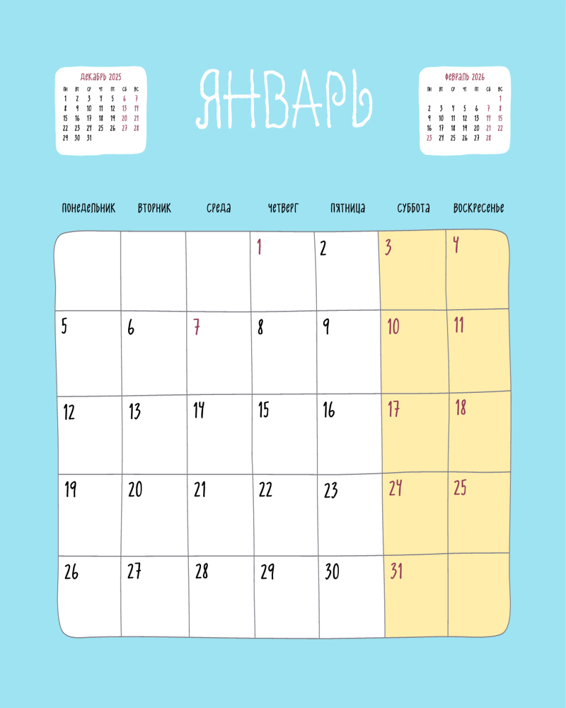 Серия: Календари настенные 2026 (300×300) Расслабьтесь вместе с чихуахуа! Яркие и милые иллюстрации Марии Высочкиной напомнят, как важно отдыхать и радоваться мелочам каждый месяц года. Наши настенные календари отличаются высоким качеством исполнения! Тщательно подобранные иллюстрации, напечатанные на глянцевой бумаге высочайшего качества, станут настоящим украшением дома, а в календарной сетке найдется место для ваших планов: большие клетки позволят делать записи и организовать свой год! |
