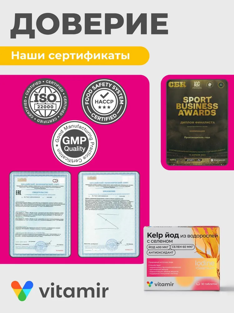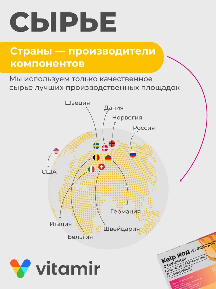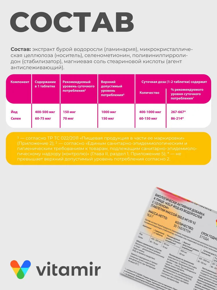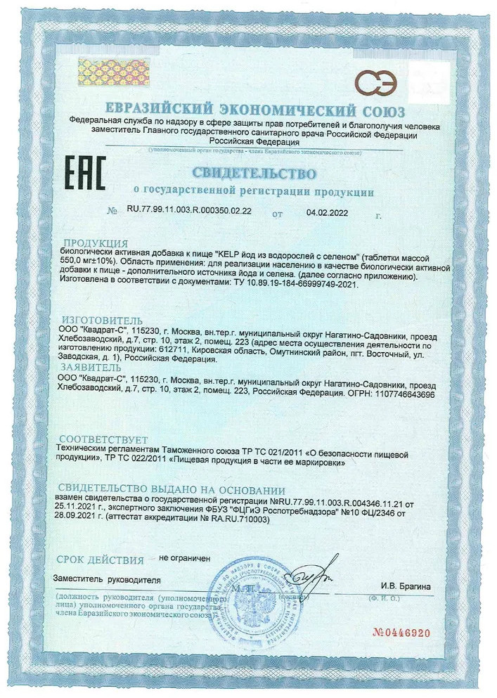 Морская капуста, или ламинария (Laminaria saccharina), относится к классу бурых морских водорослей, которые отличаются высоким содержанием биологически активных веществ, витаминов и важных микроэлементов, необходимых для поддержания жизнедеятельности организма и хорошего самочувствия. Добавление селена обеспечивает дополнительную антиоксидантную (противоокислительную) и иммунную защиту. KELP йод из бурых водорослей — биологически активная добавка к пище, дополнительный источник йода и селена.
