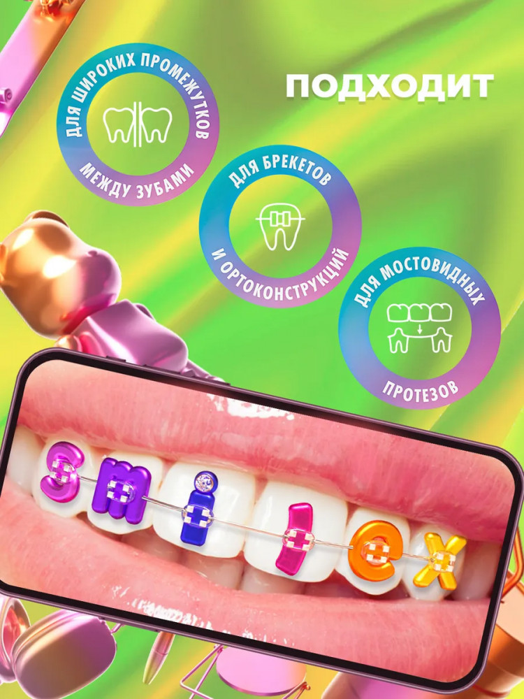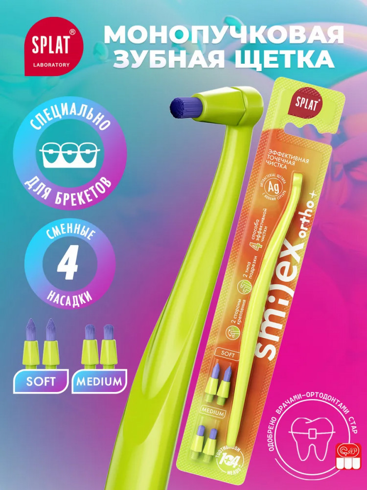 ® «Smilex Ortho+» — необходимое дополнение к мануальной щетке для более качественной гигиены полости рта. Это щетка всего с одним пучком, состоящим из 850 щетинок. Монопучок с плотно набитой щетиной легко прочищает стенки дальних жевательных зубов, фиссуры и десневую бороздку, а также удаляет налет вокруг имплантов и других ортодонтических и ортопедических конструкций.