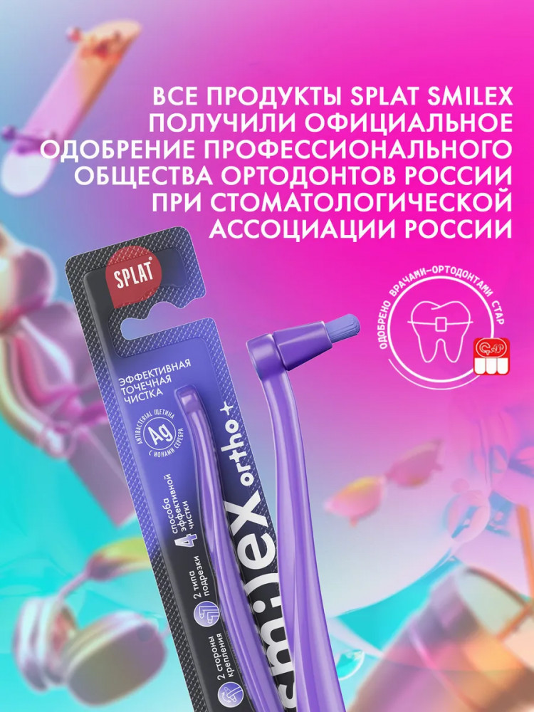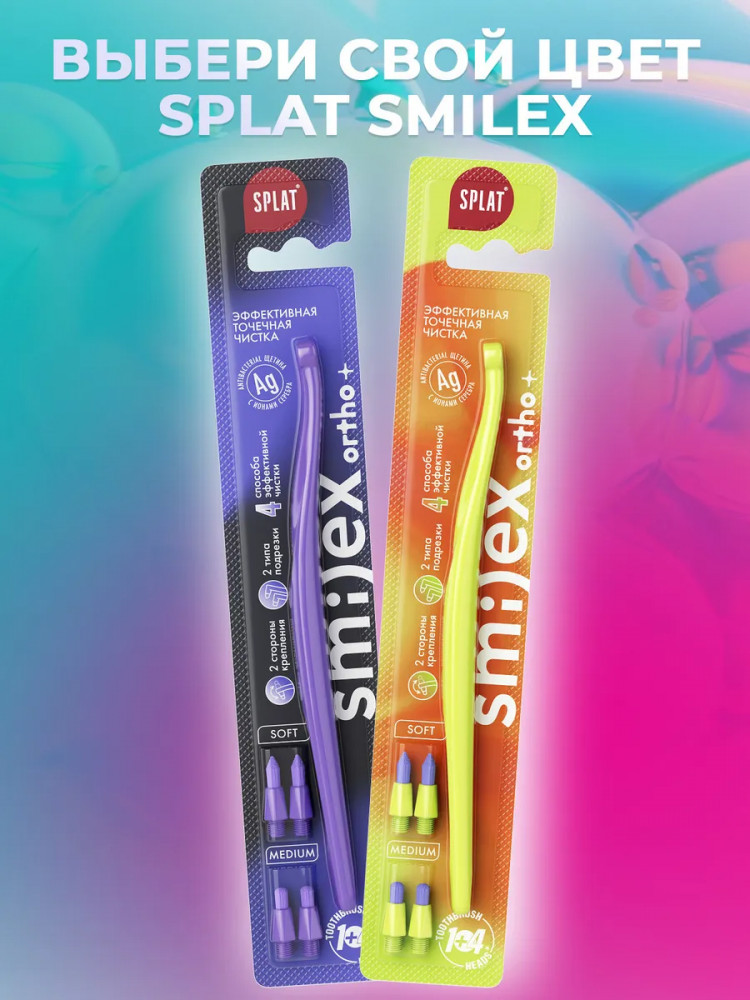 ® «Smilex Ortho+» — необходимое дополнение к мануальной щетке для более качественной гигиены полости рта. Это щетка всего с одним пучком, состоящим из 850 щетинок. Монопучок с плотно набитой щетиной легко прочищает стенки дальних жевательных зубов, фиссуры и десневую бороздку, а также удаляет налет вокруг имплантов и других ортодонтических и ортопедических конструкций.