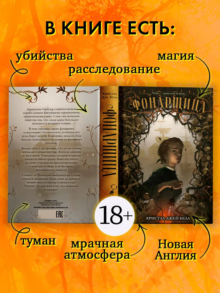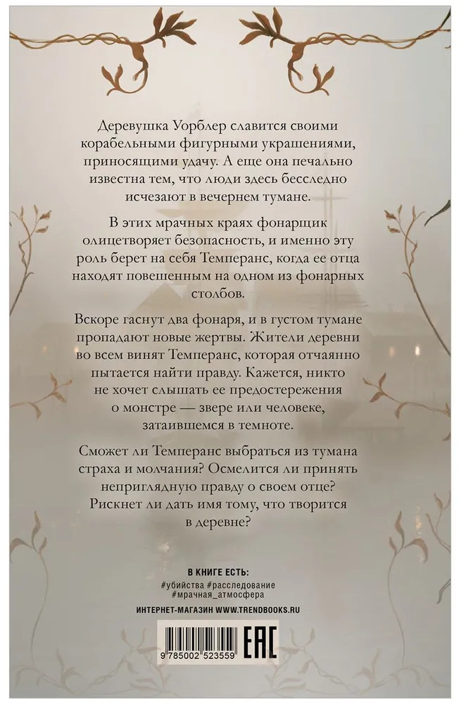 💳 Оплатить за товар можно при получении 🇰🇿 Есть бесплатная доставка по Казахстану 🎁 Копите бонусы с каждой покупки Серия: #trendbooks Честь — нести свет во тьму. Деревня Уорблер печально известна: ее славят корабельные фигуры, приносящие удачу, но проклинают за вечерний туман, бесследно поглощающий людей. В этом сумрачном мире фонарщик — символ спасения. Именно эту роль берет на себя Темперанс, когда ее отца находят повешенным на одном из фонарных столбов. |