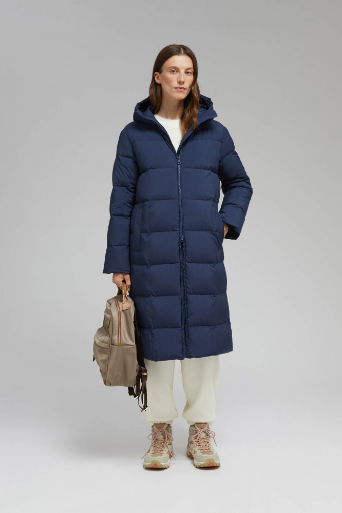 Стеганое пуховое пальто из технологичной ткани с водоотталкивающей пропиткой отлично подойдет для прохладного межсезонья. Материал надежно защищает от дождя, устойчив к загрязнениям и отличается износостойкостью. В качестве утеплителя использовали натуральный утиный пух, который отлично согревает, легок и создает внутри изделия комфортный микроклимат. Благодаря полимерному покрытию пухпакета утеплитель не мигрирует через ткань. Легкий и прочный подклад обработан антибактериальной и полиуретановой пропитками, которые предотвращают развитие микрофлоры и продлевают срок службы изделия. Модель А-силуэта дополнена капюшоном. Эластичная резинка на манжетах комфортно прилегает к телу и защищает от попадания холодного воздуха внутрь. Предусмотрены функциональные карманы. Пальто застегивается на центральную молнию.