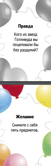 Набор карточек-мотиваторов «Правда или желание». 45 карточекВ данный момент этот товар отсутствует в продаже. Возможно, у нас найдется аналогичный или похожий товар здесь. Серия: Наборы карточек для взрослых Заменяет книгу Фанты для веселой компании (45 карточек) За столом можно провести время не только вкусно, но и весело! 45 фантов расшевелят любую компанию — и даже на время отвлекут от застолья. Вытащите фант, прочитайте задание — и проявите свои способности. Играем по-взрослому! |