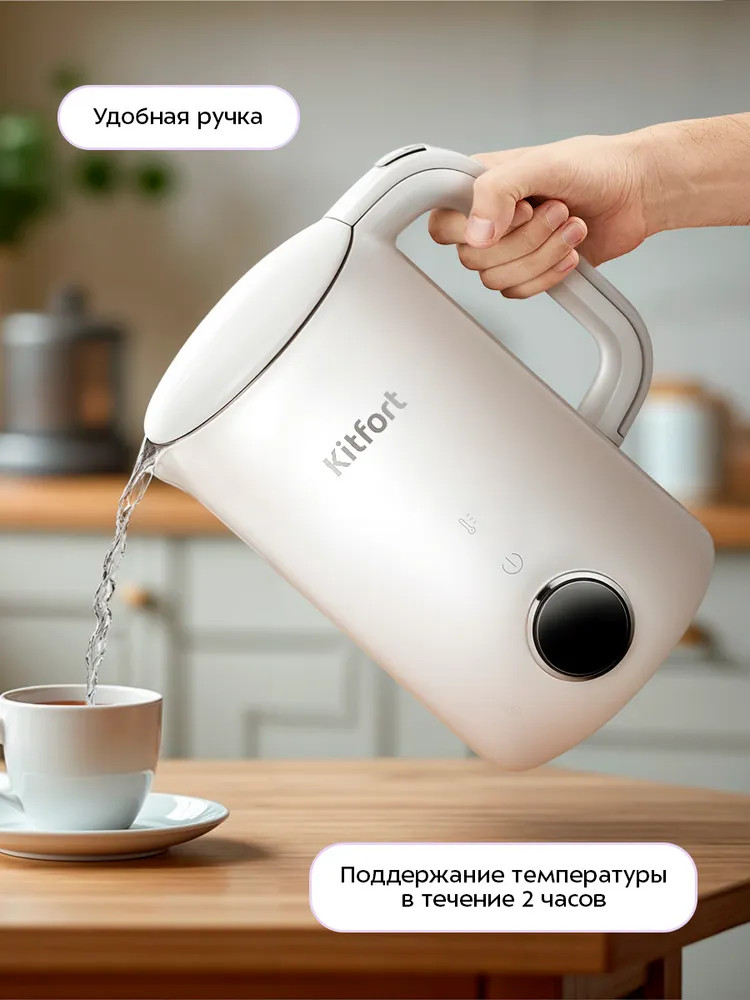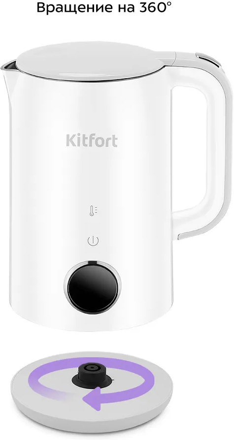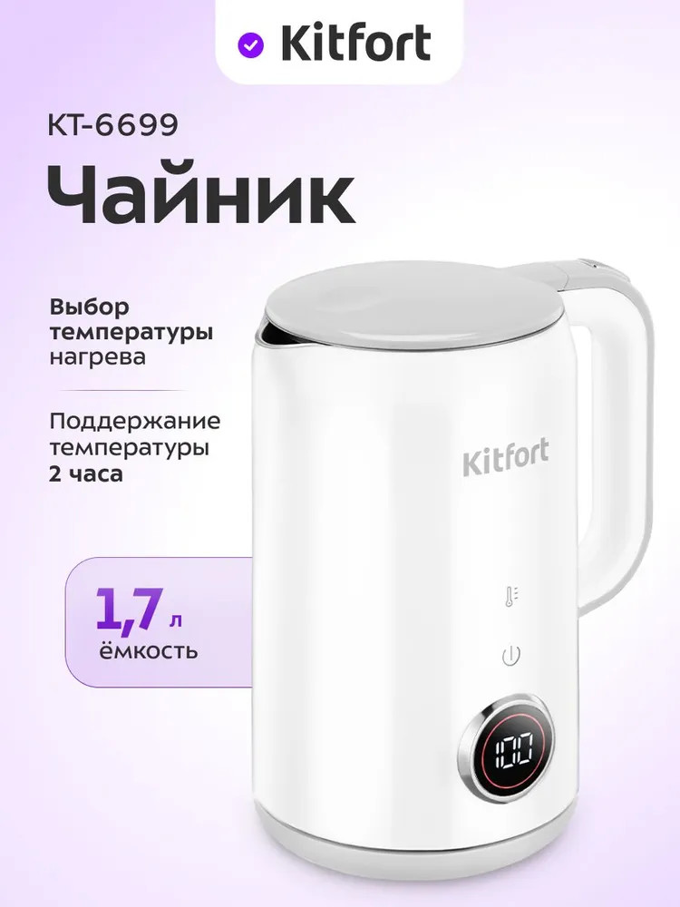 Kitfort Чайник электрический КТ-6699В данный момент этот товар отсутствует в продаже. Возможно, у нас найдется аналогичный или похожий товар здесь. Чайник Kitfort КТ-6699 предназначен для кипячения воды дома, в офисе, на даче. Чайник оснащён функцией поддержания температуры в течение 2 часов. Температура воды контролируется встроенным термодатчиком. На чайнике расположена панель управления и дисплей. На дисплее отображается текущая температура воды, а при установке — температура нагрева. КТ-6699 может не только вскипятить воду, но и нагреть её до 40, 50, 60, 70, 80, 90 °C. Корпус чайника и крышка выполнены из пластика, их внутренняя поверхность — из нержавеющей стали. Ручка сделана из пластика, за счёт чего не нагревается, позволяя комфортно пользоваться прибором. Подставка с центральным контактом даёт возможность располагать на ней чайник в любом положении, обеспечивая вращение на 360°. Перед снятием чайника с подставки дождитесь его автоматического выключения или отключите его, нажав на переключатель. |