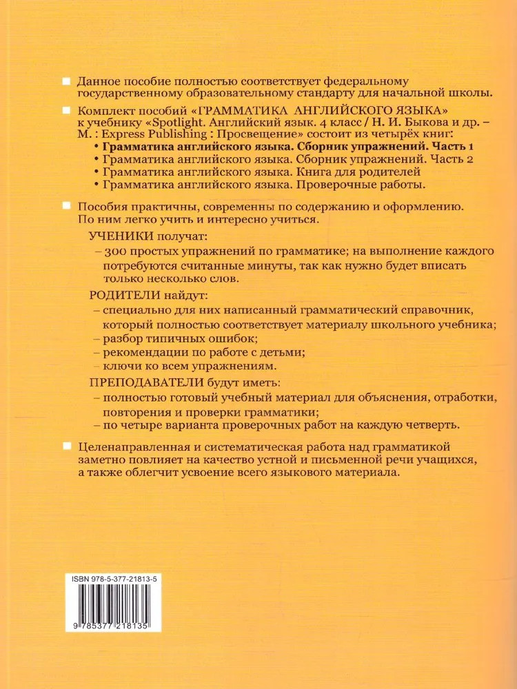 💳 Оплатить за товар можно при получении 🇰🇿 Есть бесплатная доставка по Казахстану 🎁 Копите бонусы с каждой покупки Серия: Учебно-методический комплект. Начальная школа Английский язык 4 класс. Грамматика. Сборник упражнений. Часть 1. Настоящее пособие полностью соответствует федеральному государственному образовательному стандарту для начальной школы. Пособие содержит 300 грамматических упражнений, обеспечение их обучения и закрепление правил грамматики, которые изучаются в 4 классе. Специально разработанные задания направлены на интенсивное обучение, позволяя экономить время и достигать высокого уровня грамматической подготовки. Для учащихся 4 класса, изучающих английский язык по учебнику Н. И. Быковой и др. |
