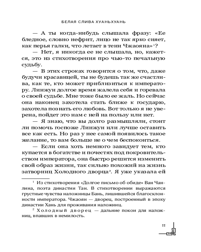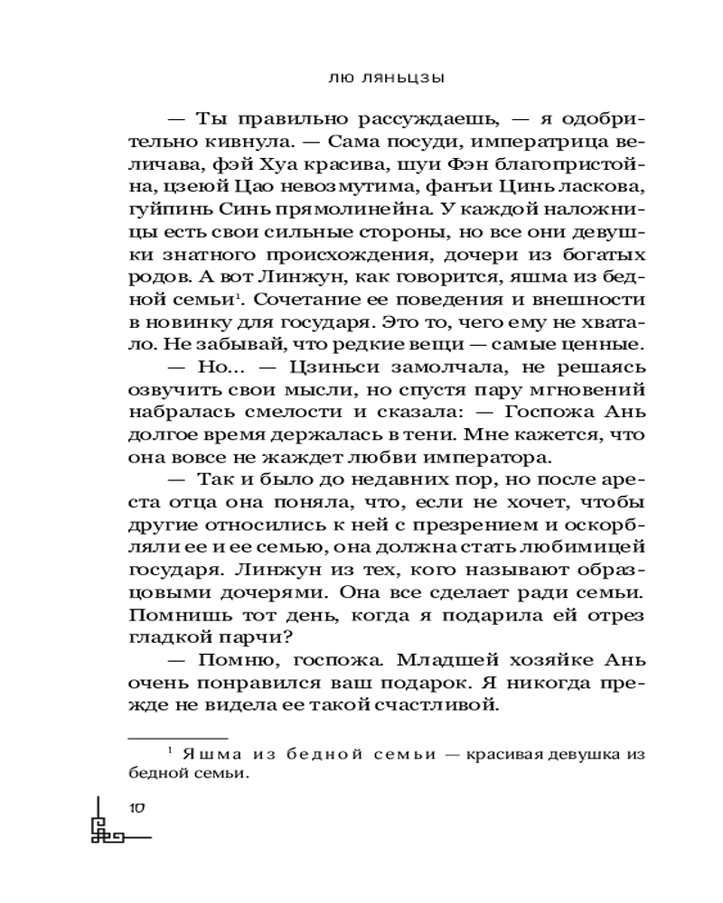 Серия: Freedom. История одной наложницы. Легенда о Чжэнь Хуань Второй том «Истории одной наложницы. Легенда о Чжэнь Хуань», цикла китайской писательницы Лю Ляньцзы, повествующего о девушке, которая во время отбора произвела большое впечатление на императора и попала в его гарем. Теперь ей предстоит бороться не только с другими наложницам за внимание Сюаньлина, но и с собственными чувствами. Статус наложницы дал Чжэнь Хуань не только привилегии, но и привнес в ее жизнь серьезную опасность, поэтому она стремится заручиться поддержкой верных союзников. Девушка помогает наложнице Ань получить расположение государя, но начинает испытывать эмоции, которые не дозволены наложницам. Чжэнь Хуань нужно быть осторожной, потому что борьба за любовь императора подобна хождению по раскаленным углям: больно, опасно и никогда не знаешь, какой шаг станет последним. |