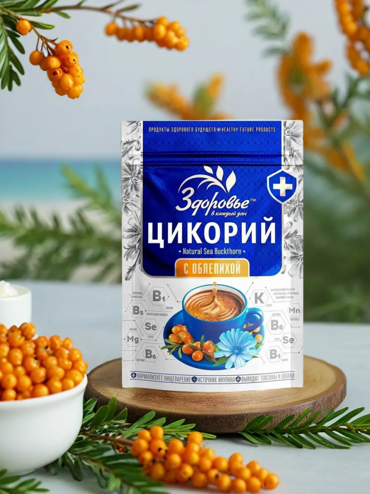 Цикорий «Здоровье» с облепихой — это быстрорастворимый напиток, полученный из корней одноимённого растения с добавлением натурального экстракта облепихи. Он представляет собой 100% натуральный экстракт. Корень цикория тщательно высушивают и перемалывают до состояния порошка. Полученный продукт — это достойная замена кофе для людей с заболеваниями сердца и сосудов. Он обогащён полезными элементами, минералами и витаминами, но, в отличие от кофе, не содержит кофеин, способный нанести вред организму при чрезмерном употреблении.
