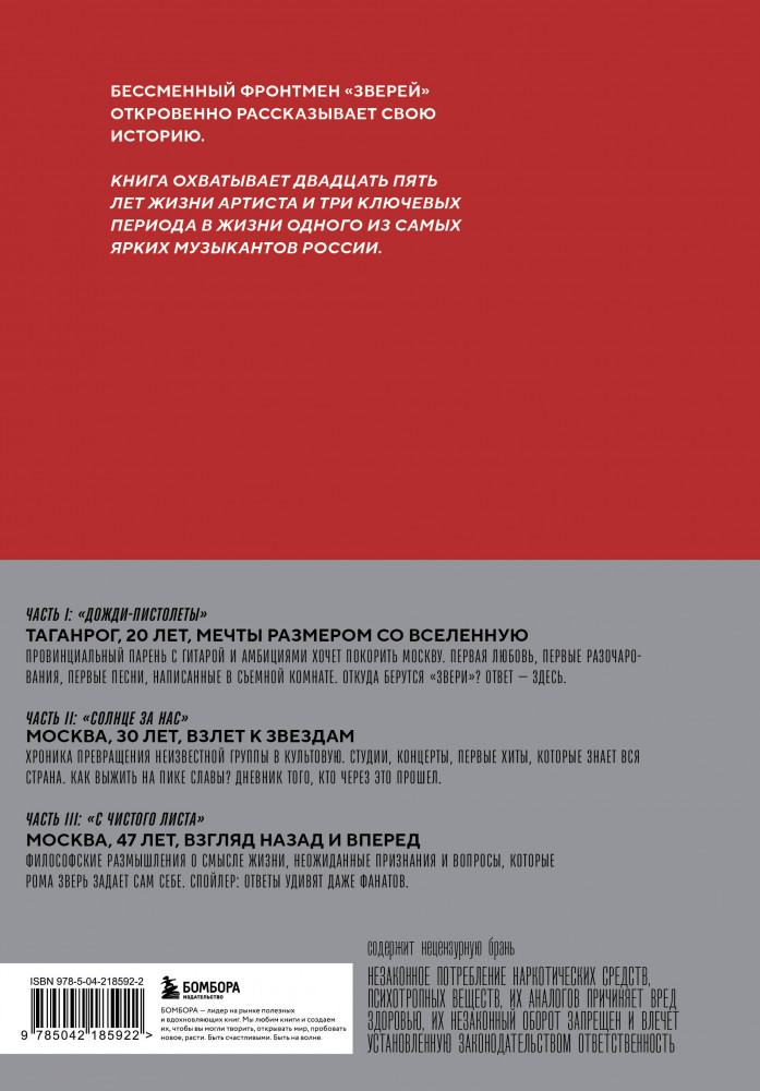 Серия: ЗВЕРИ. Книга от легендарного солиста группы Бессменный фронтмен «Зверей» откровенно рассказывает свою историю. Книга охватывает двадцать лет жизни артиста и три ключевых эпохи: провинциального парня из Таганрога с мечтами размером со Вселенную (первая часть «Дожди-пистолеты»), хронику превращения неизвестной группы в культовую (вторая часть «Солнце за нас») и философские размышления зрелого артиста, который задает себе неожиданные вопросы (третья часть «С чистого листа»). |