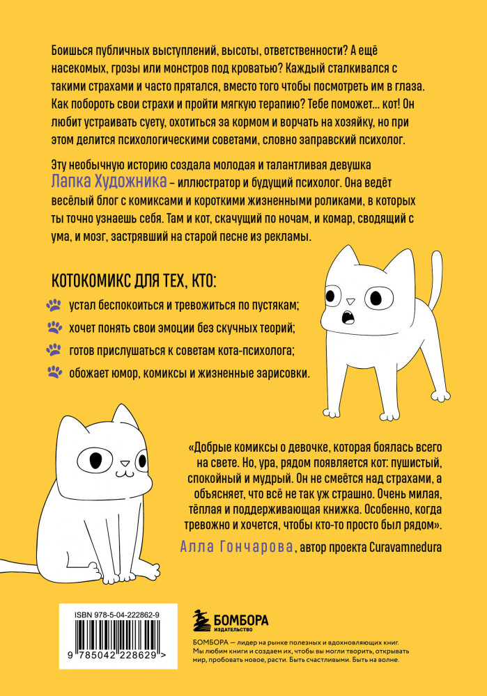 Серия: Кототерапия. Комиксы для для тех, кто устал тревожиться Боишься публичных выступлений, высоты, ответственности? А еще насекомых, грозы или монстров под кроватью? Каждый сталкивался с такими страхами и часто прятался, вместо того чтобы посмотреть им в глаза. Как побороть свои страхи и пройти мягкую терапию? Тебе поможет... кот! Он любит устраивать суету, гоняться за едой и ворчать на хозяйку, но при этом делится психологическими советами, словно заправский психолог. Эту необычную историю создала молодая и талантливая девушка — Лапка Художника — иллюстратор и будущий психолог. Она ведет веселый блог с комиксами и короткими жизненными роликами, в которых ты точно узнаешь себя. Там и кот, скачущий по ночам, и комар, сводящий с ума, и мозг, застрявший на старой песне из рекламы. |
