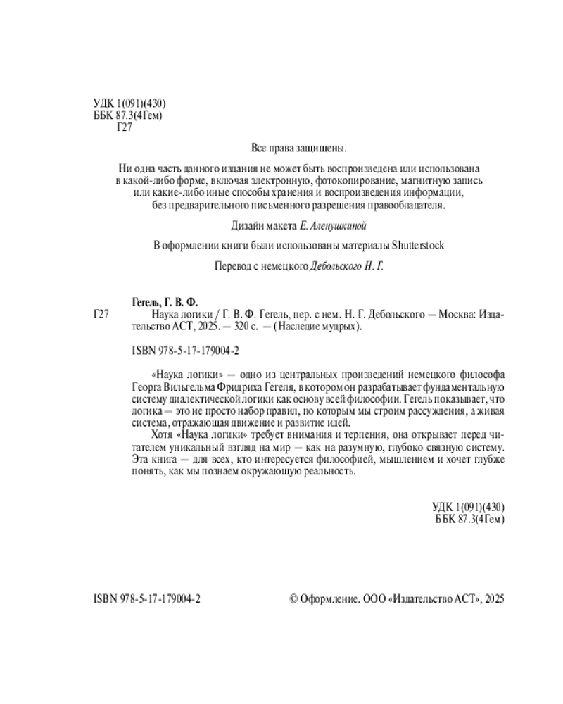 Серия: Наследие мудрых «Наука логики» — одно из центральных произведений немецкого философа Георга Вильгельма Фридриха Гегеля, в котором он разрабатывает фундаментальную систему диалектической логики как основу всей философии. Гегель показывает, что логика — это не просто набор правил, по которым мы строим рассуждения, а живая система, отражающая движение и развитие идей. Хотя «Наука логики» требует внимания и терпения, она открывает перед читателем уникальный взгляд на мир — как на разумную, глубоко связную систему. Эта книга — для всех, кто интересуется философией, мышлением и хочет глубже понять, как мы познаем окружающую реальность. |