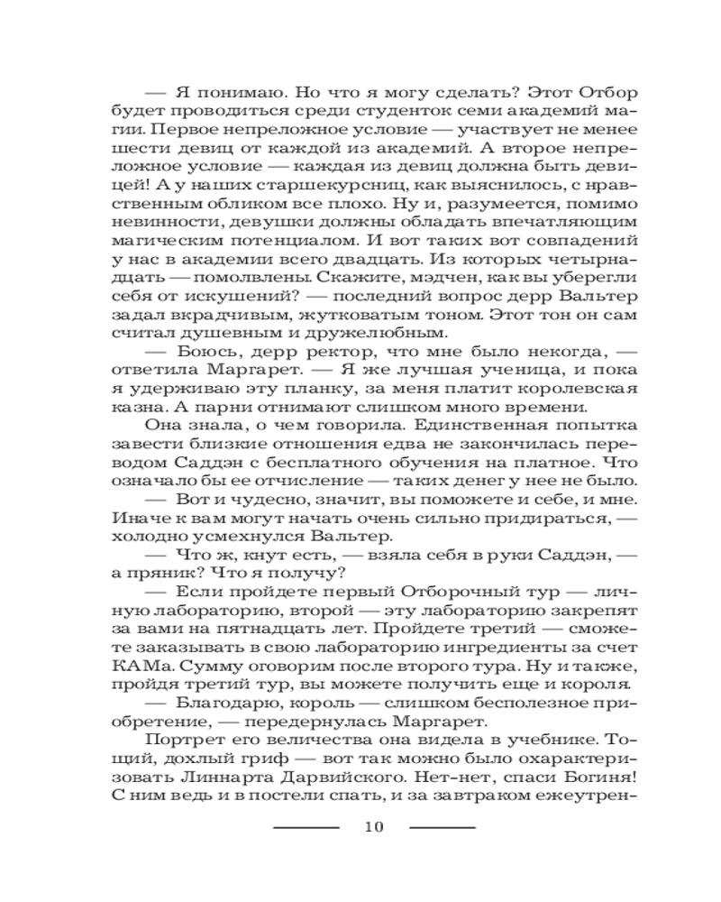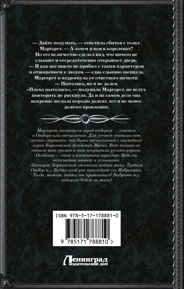 Серия: Другие миры Маргарет поставили перед выбором — участие в Отборе или отчисление. Для лучшей ученицы нет ничего страшнее, чем быть отчисленной с последнего курса Королевской Академии Магии. Вот только не стоило так громко и так неприятно ругать короля. Особенно — стоя в пустынном коридоре. Ведь его величество может и услышать. Линнарт Дарвийский отчаялся найти жену. Третий Отбор и... Будто злой рок преследует его Избранниц. Тогда, может, пойти от противного? Выбрать ту, которую будет не жаль? |