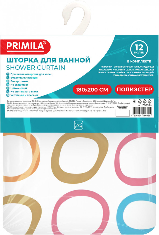 Шторка для ванной комнаты PRIMILA — залог чистоты и уюта ванной комнаты. Используется для защиты пола, стен, мебели и зеркала от брызг. Эта шторка идеально впишется в любой интерьер. Шторка для ванной PRIMILA изготовлена из качественного, практичного, износостойкого полиэстера, что гарантирует отсутствие заломов и водостойкость. Быстро сохнет, не шуршит, без запаха и приятная на ощупь. Шторку можно стирать в стиральной машине. Гладить и отпаривать рекомендуется при температуре не выше 110 °С. |