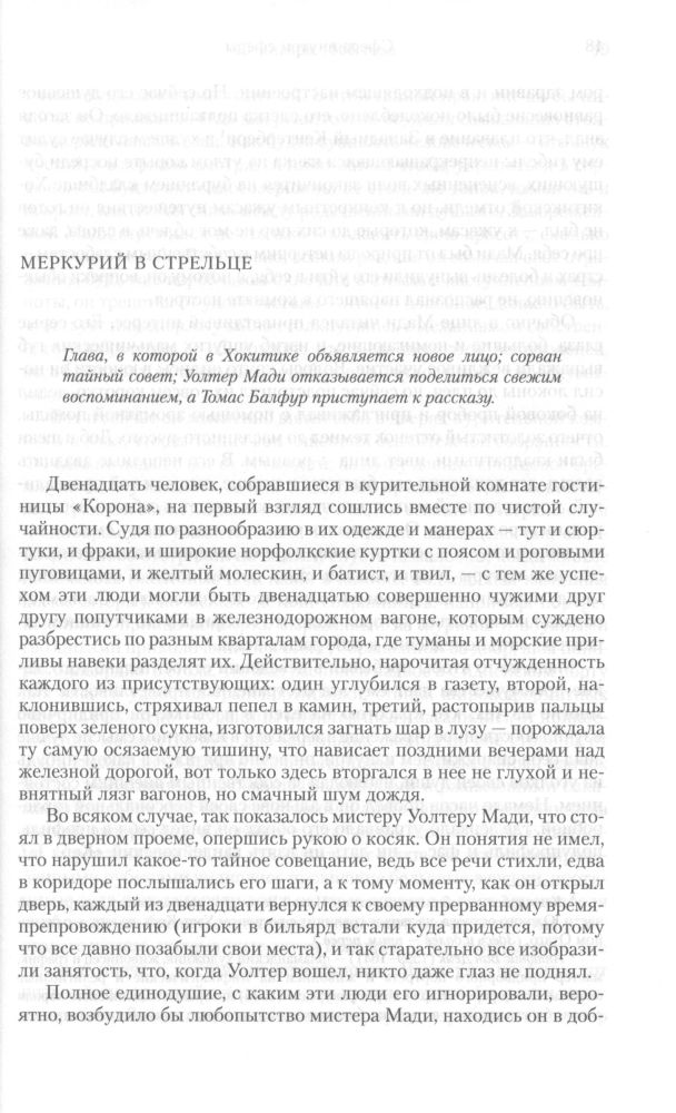 Добро пожаловать в Новую Зеландию в самый разгар золотой лихорадки. Двенадцать человек – включая священника, аптекаря, издателя местной газеты, двух китайцев и туземца-маори – сходятся в задней комнате захудалой гостиницы обсудить несколько таинственных происшествий, в которые они так или иначе оказались впутаны: бесследно исчез фантастически удачливый юноша, которому принадлежит львиная доля местных участков, а в хижине умершего той же ночью бедного старателя обнаружился огромный золотой клад, после чего самая популярная из «ночных бабочек» Хокитики решительно встала на путь исправления. Двенадцать заговорщиков выкладывают все как на духу случайно затесавшемуся в их ряды незнакомцу. Тут и кораблекрушения, и контрабандное золото, и шантаж, и несчастная любовь, мошенничество, месть, случайные выстрелы, спиритический сеанс и суд; есть тут и пропавшие грузовые контейнеры, и спрятанные документы, и потерянные состояния. Казалось бы, «Светила» – это добрый старый детектив наподобие «Женщины в белом» Уилки Коллинза. Однако структура книги основывается на астрологии: автор рассчитывала движение звезд и планет по мере развития сюжета, ведь действующие лица связаны с небесными телами. Двенадцать «звездных» героев, соответствующих зодиакальным знакам, и семь «планетарных» – все вращаются вокруг героя-«земли», убитого при таинственных обстоятельствах. |