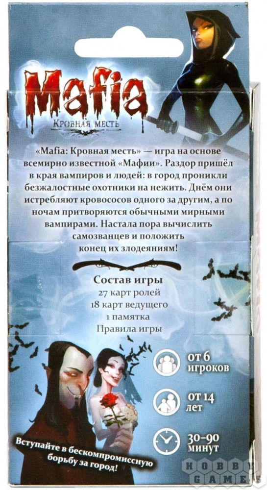 Благородные вампиры выходят на бой против коварных охотников на нечисть, которые прячутся под масками мирных граждан. Вычисли, кто же скрывается под маской благонадежности и найди самозванцев! Легендарная «Мафия» теперь в модной вампирской адаптации. В отличии от классического варианта, в этой игре опасно именно днем, ведь в светлое время суток вампиры засыпают, а фанатичные охотники выходят за своим кровавым уловом. Помимо этого изменения и веселых вампирских иллюстраций, в остальном это все та же любимая всеми «Мафия» с ее детективным сюжетом, острой интригой и борьбой двух противоборствующих сторон. Вам необходимо как можно быстрее вычислить, кто же прячется под маской добропорядочного горожанина, истребить всех врагов своей команды и уцелеть самому. Классический вариант «Мафии» был придуман московским студентом в 1986 году, но с тех пор прочно занял место одной из самых популярных игр для больших компаний во всем мире. |