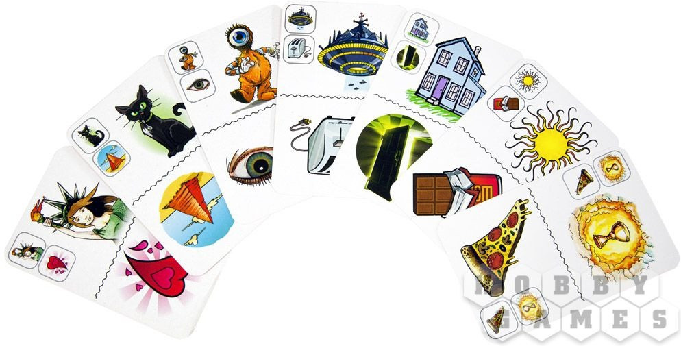 В начале партии каждому игроку раздаются по семь карт. Каждая карта содержит два рисунка. После этого игроки выкладывают карты из колоды для образования сброса. Вы можете выложить карту с руки на любую колоду сброса, если совпадает один из двух рисунков. Игроки не ходят по-очереди, а выкладывают карты, как только заметили, что могут выложить карту. Если игроки делают это одновременно, то игрок, который положил первым, оставляет, другой же игрок забирает карту обратно в руку. Кто победил? Всё очень просто и честно: тот, кто смог первым избавится от всех своих карт и не запутаться в этой заварушке, объявляется победителем! |