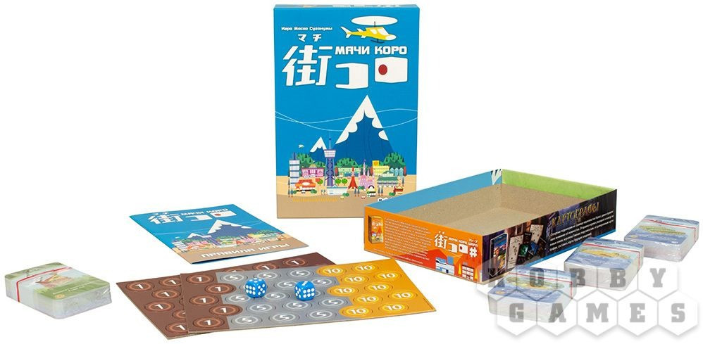 Настольная игра «Мачи Коро» — игра для 2-5 игроков, которые хотят окунуться в уютную Японию. Вы берёте на себя роль мэра маленького, но амбициозного городка. Как мэр, который любит свой город, вы хотите его процветания и развития. Стройте закусочные и аэропорты, украшайте улочки садами и достопримечательностями, а результат не заставит себя долго ждать. Но не забывайте, что близлежащие городки тоже не стоят на месте, и вам предстоит вступить в нешуточную борьбу за право провозгласить свой город лучшим!