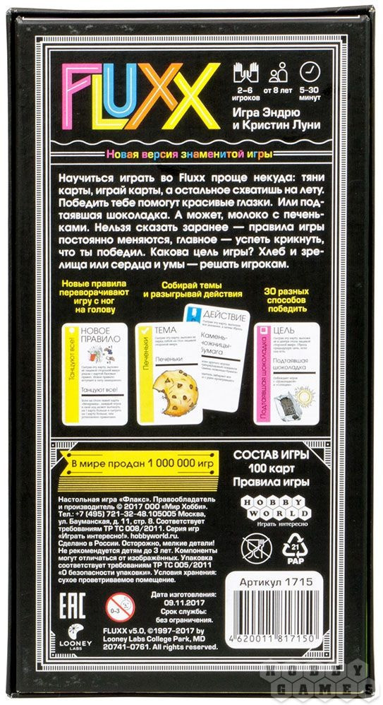 Научиться играть во Fluxx проще некуда: тяни карты, играй карты, а остальное схватишь на лету. Победить тебе помогут красивые глазки. Или подтаявшая шоколадка. А может, молоко с печеньками. Нельзя сказать заранее — правила игры постоянно меняются, главное — успеть крикнуть, что ты победил. Какова цель игры? Хлеб и зрелища или сердца и умы — решать игрокам. Новая версия знаменитой игры Fluxx! |