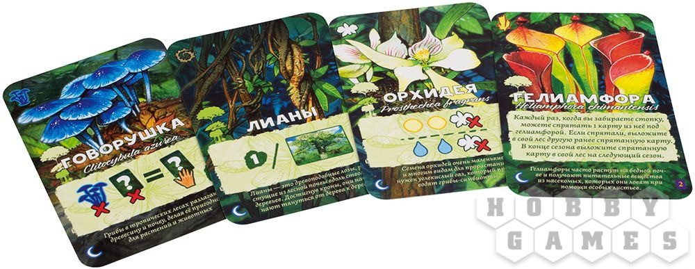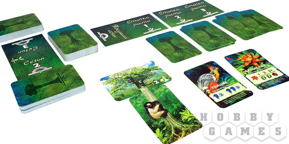 Правила игры: основные правила «Амазонии» рассчитаны на дуэльное противостояние, но включают вариант игры для 3 и 4 игроков, а также соло-режим. Перед началом игры поместите в центре стола 3 обычные карты сезона/роста. Перемешайте колоду тропического леса и случайным образом уберите из неё 10 карт, а оставшиеся разделите на 3 приблизительно равные стопки и положите по одной рядом с каждой из карт сезонов. В закрытую положите из стопки текущего сезона одну карту в зону роста 1, две карты в зону роста 2 и три карты в зону роста 3. Карты — это животные и деревья, которые имеют свои эффекты. Одни из них приносят очки сразу, а другие только в конце сезона или игры.