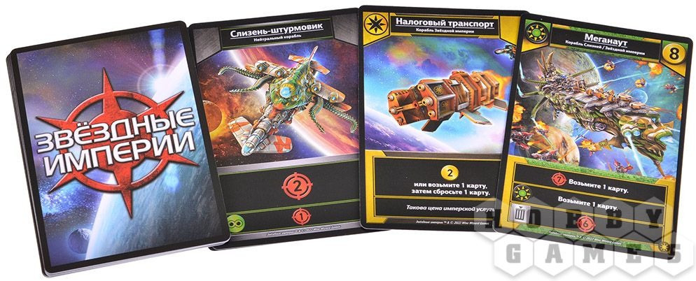 Карты обладают различными свойствами, которые применяются в различные фазы хода и дают вам уникальные бонусы или способности, на которых и будет построена ваша стратегия победы. С помощью карт приобретают очки боя, торговли или влияния — это ваши основные ресурсы на игру.