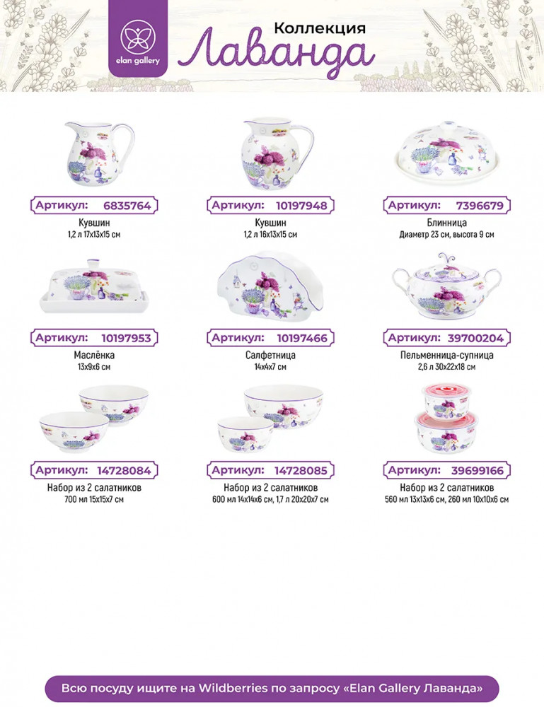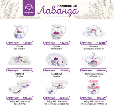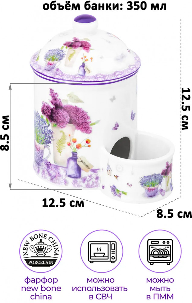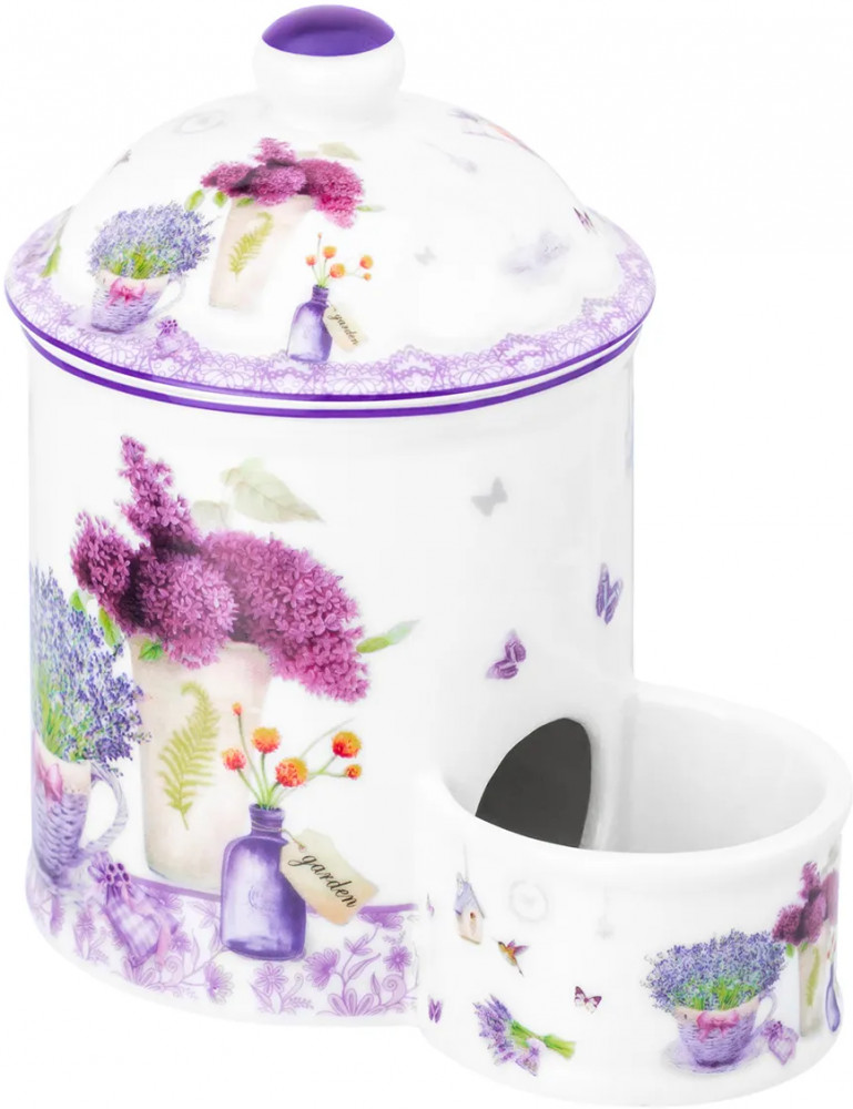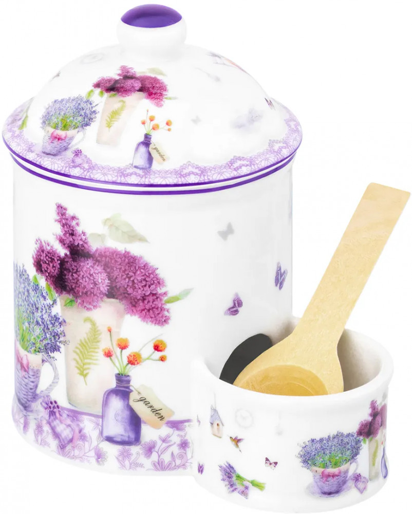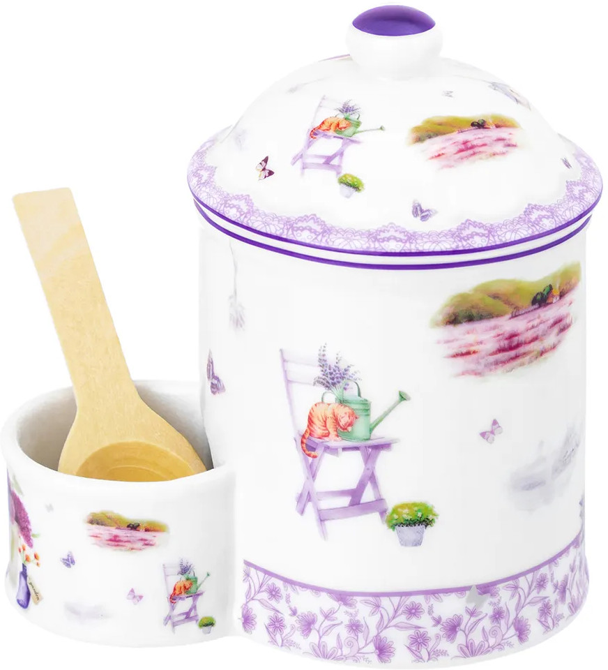 Серия украшена нежным принтом на тему Прованса — французской провинции, которая славится своими лавандовыми полями и красивыми пейзажами. Изображение пышных букетов лаванды и гортензии позволит окунуться в атмосферу тепла, гармонии и южного солнца, не покидая вашей кухни или столовой! Ложка выполнена из натурального бамбука. Ёмкость подойдёт для хранения разнообразных сыпучих продуктов. Заполните её сахаром, солью, а также другими специями и приправами, чтобы во время приготовления и приёма пищи всё необходимое было под рукой. Засыпьте внутрь чай или кофе, чтобы заварить свежий напиток. Подайте вместе с горячими блюдами — каждый сможет приправить пищу по своему вкусу. Ложечка поможет удобно набрать необходимое количество продуктов. Оригинальная форма банки позволяет эффективнее расходовать содержимое и предотвращать скопление остатков на дне. Поставляется в дизайнерской картонной коробке — благодаря ей вам не потребуется дополнительная подарочная упаковка. Фарфоровая сервировочная посуда будет оригинальным подарком для хозяйки, ценящей не только практичность, но и привлекательность. Серия «Лаванда» от бренда Элан Галерея станет украшением любого кухонного инвентаря и позволит собрать сервиз в едином стиле!