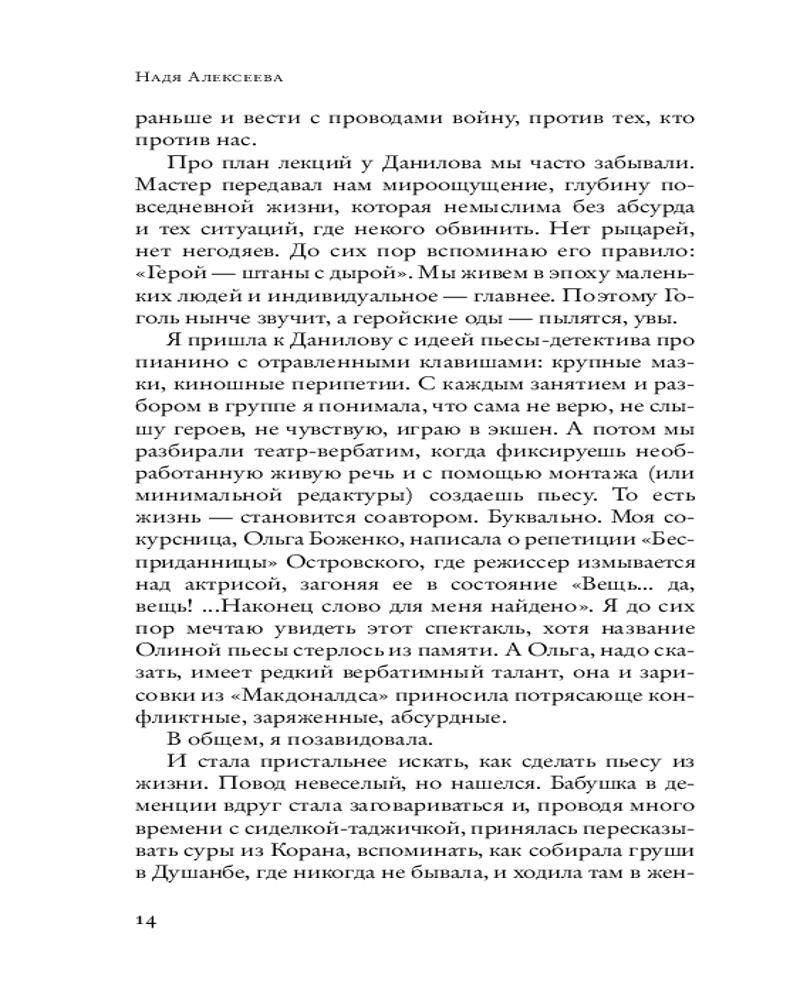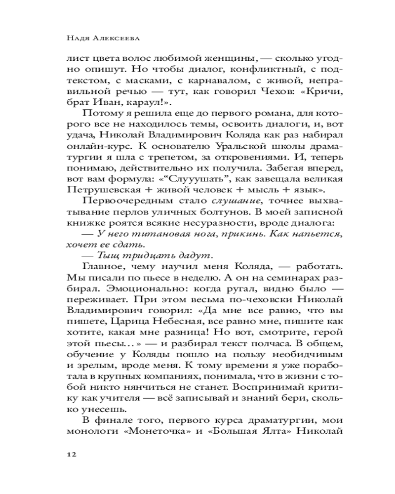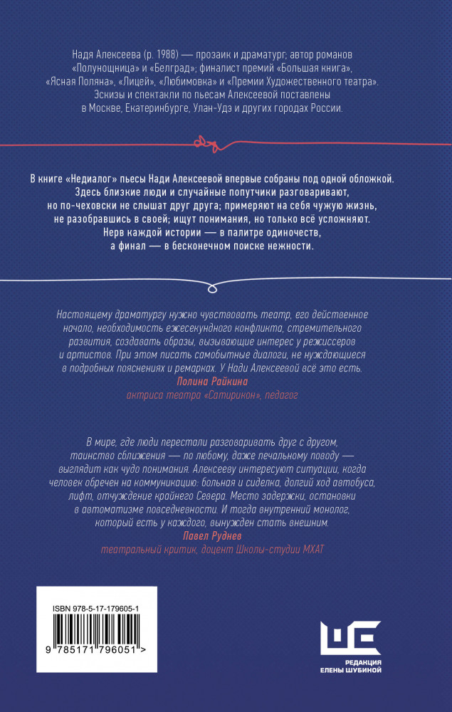 Серия: По ролям Надя Алексеева (р. 1988) — прозаик и драматург, автор романов «Полунощница» и «Белград», финалист премий «Большая книга», «Ясная Поляна», «Лицей», «Любимовка» и «Премии Художественного театра». Эскизы и спектакли по пьесам Алексеевой поставлены в Москве, Екатеринбурге, Улан‑Удэ и других городах России. |