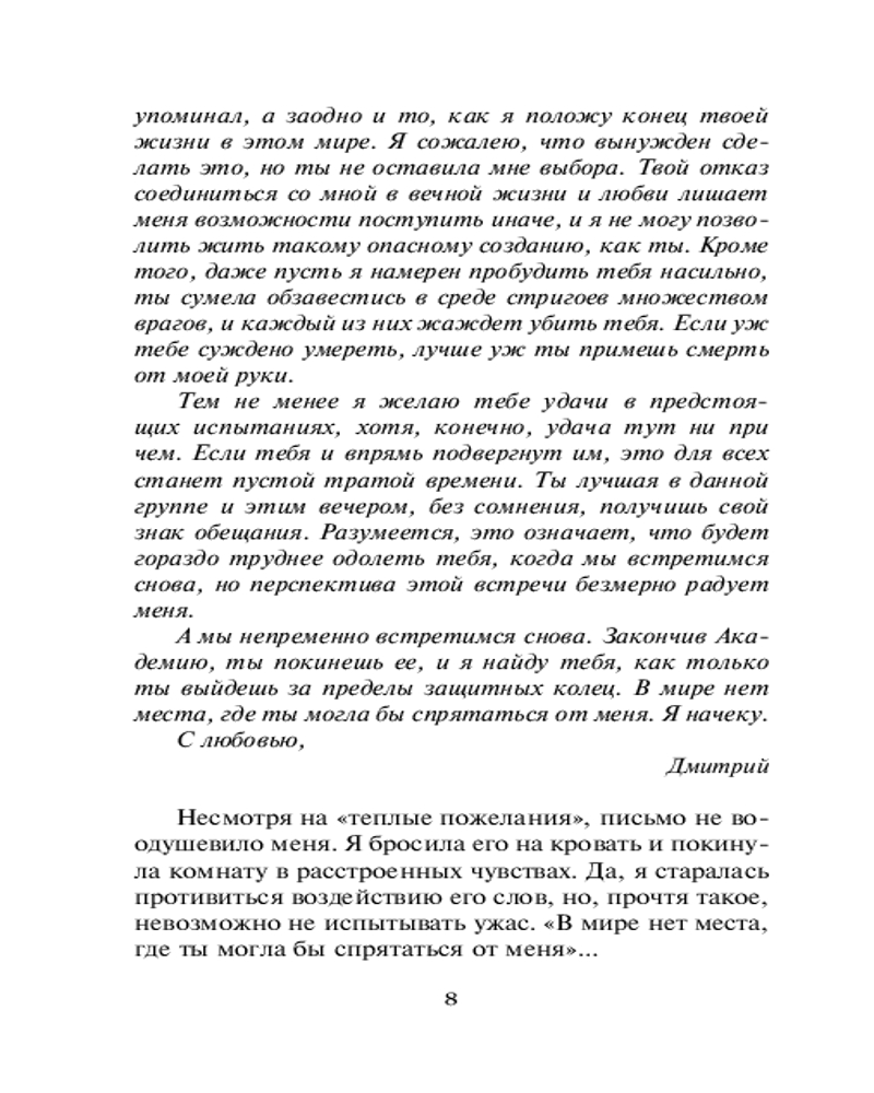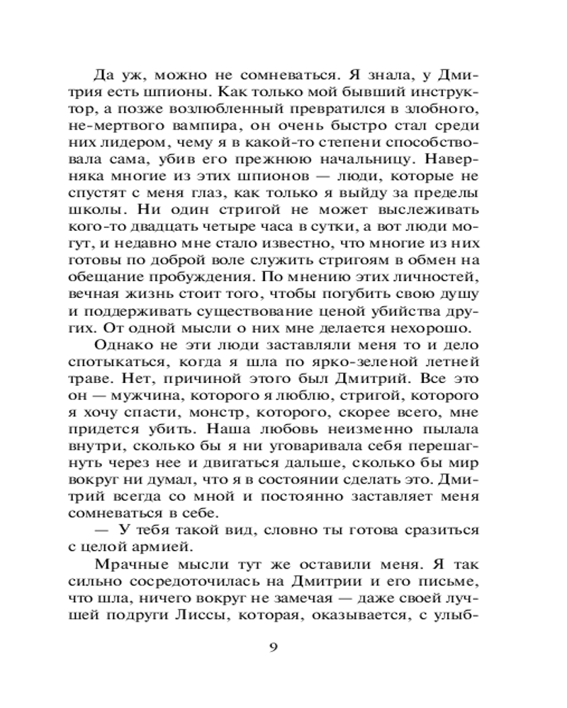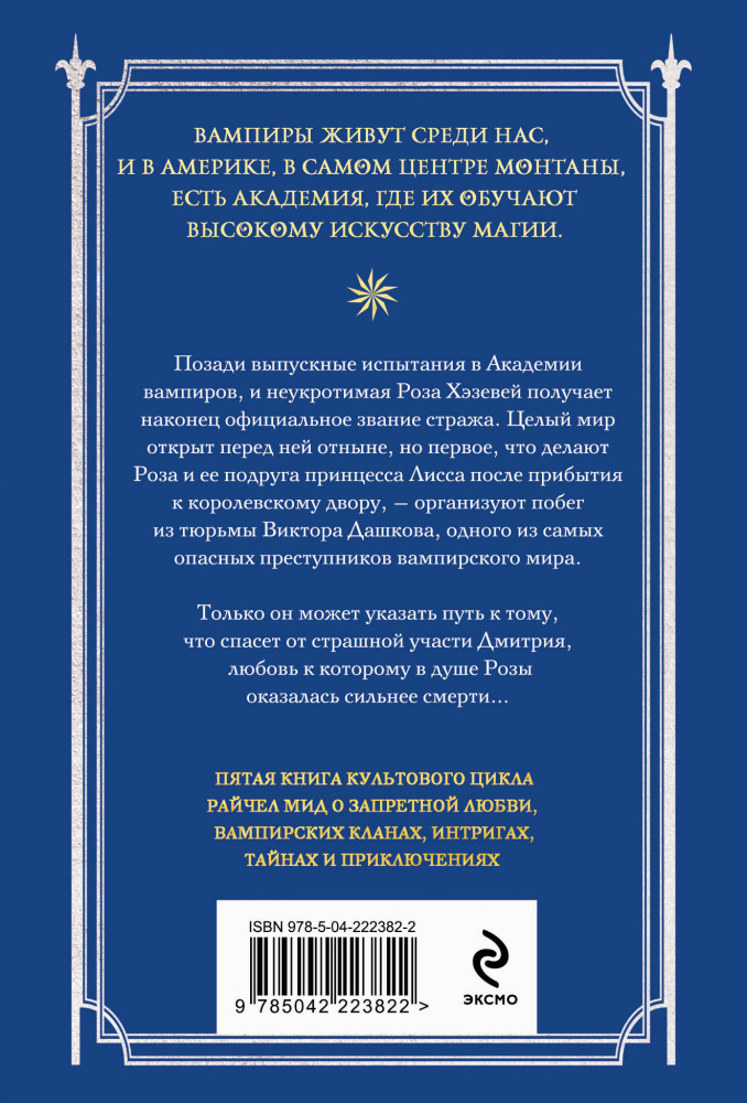 Серия: Академия вампиров (обложка) Позади выпускные испытания в Академии вампиров, и неукротимая Роза Хэзевей получает наконец официальное звание стража. Целый мир открыт перед ней отныне, но первое, что делают Роза и ее подруга принцесса Лисса после прибытия к королевскому двору — организуют побег из тюрьмы Виктора Дашкова, одного из самых опасных преступников вампирского мира. Только он может указать путь к тому, чтобы спасти от страшной участи Дмитрия, любовь к которому в душе Розы оказалась сильнее смерти... |