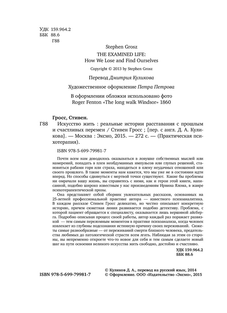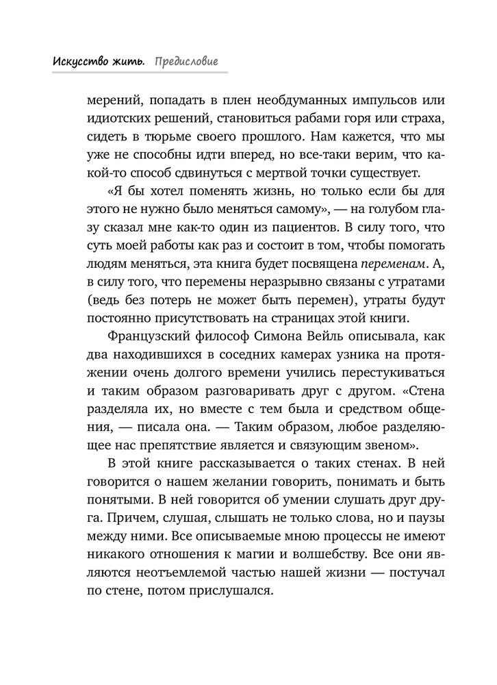 Искусство жить. Реальные историиВ данный момент этот товар отсутствует в продаже. Возможно, у нас найдется аналогичный или похожий товар здесь. Серия: Практическая психотерапия Почти всем из нас доводилось оказываться в ловушке собственных мыслей или намерений, попадать в плен необдуманных импульсов или глупых решений, становиться рабами горя или страха, находиться в плену неудачных отношений или своего прошлого. В такие моменты нам кажется, что мы уже не в состоянии идти вперед. Но способы сдвинуться с мертвой точки существуют. Какие бы проблемы ни омрачали вашу жизнь, вы справитесь с ними, как и герои этой книги, написанной, подобно широко известным у нас произведениям Ирвина Ялома, в жанре психотерапевтической прозы. |